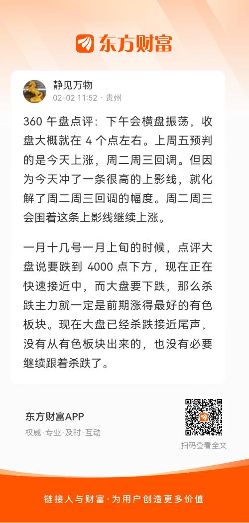 360 午盘点评:下午会横盘振荡,收盘大概就在 4 个点左右。上周五预判的是今天上涨,周二周三回调。但因为今天冲了一条很高的上影线,就化解了周二周三回调的幅度。周二周三会围着这条上影线继续上涨。
