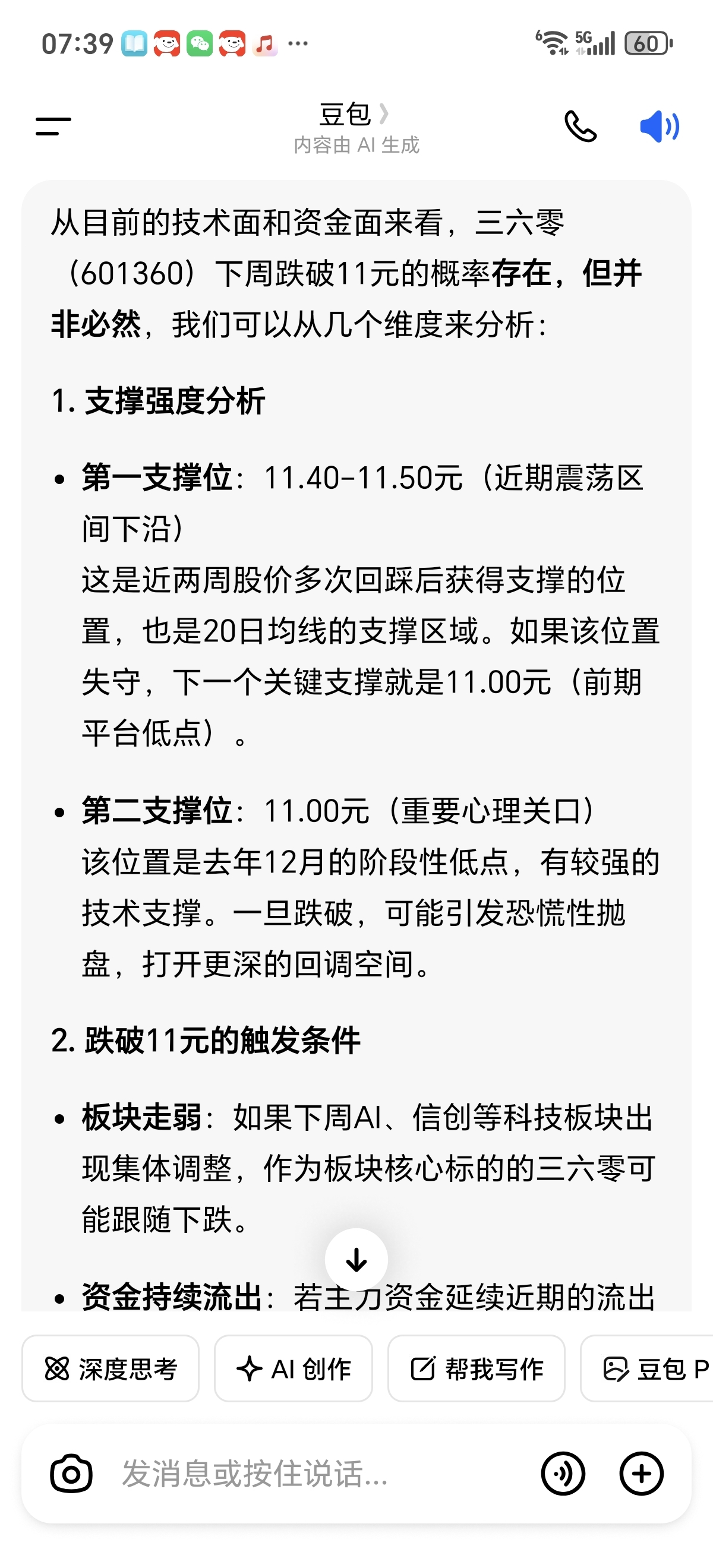 $三六零(SH601360)$ 豆包说,跌破11 很难,继续加仓干