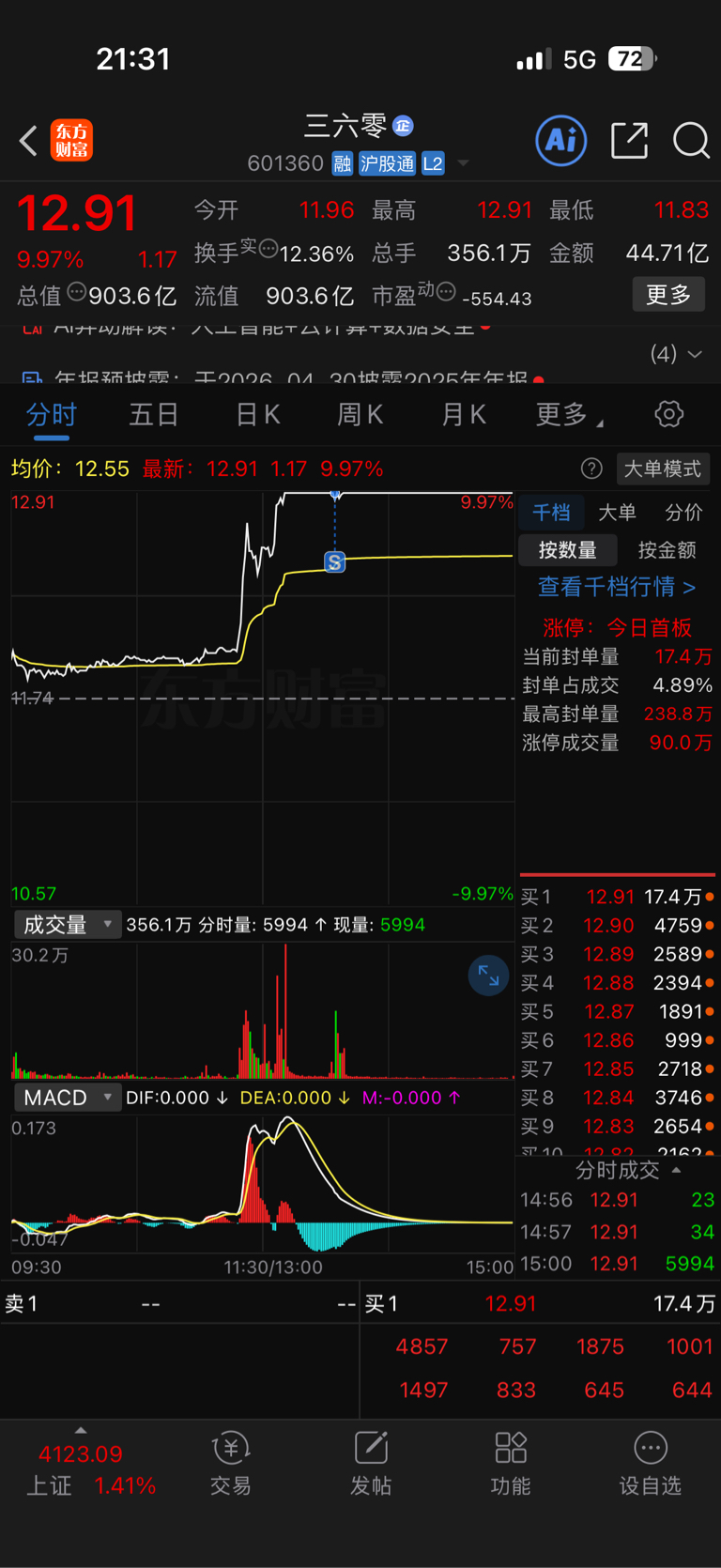 $三六零(SH601360)$ 开板的一刻洗掉我一半仓位