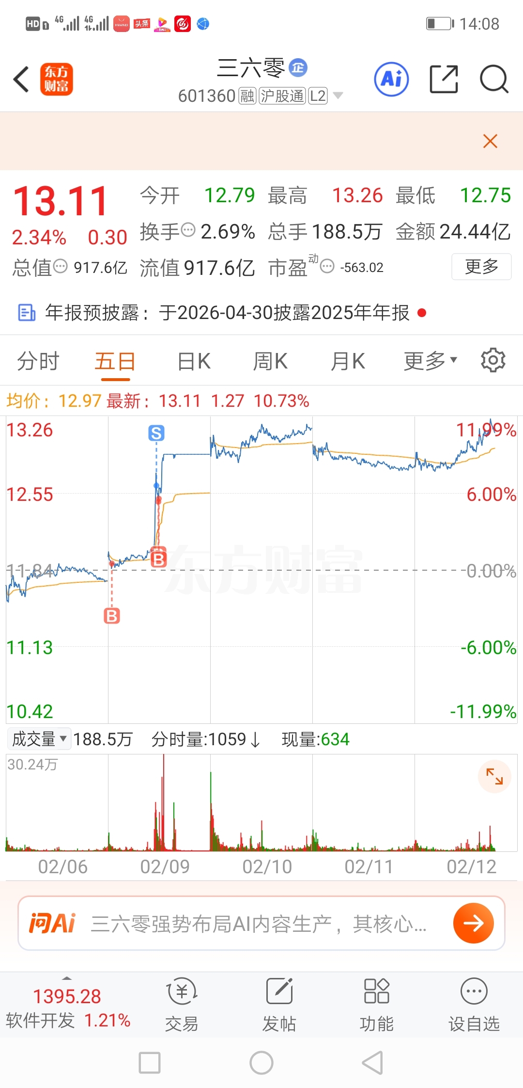 $三六零(SH601360)$ 前面11.90元买入,隔日精准做T,大家放心拿到23元