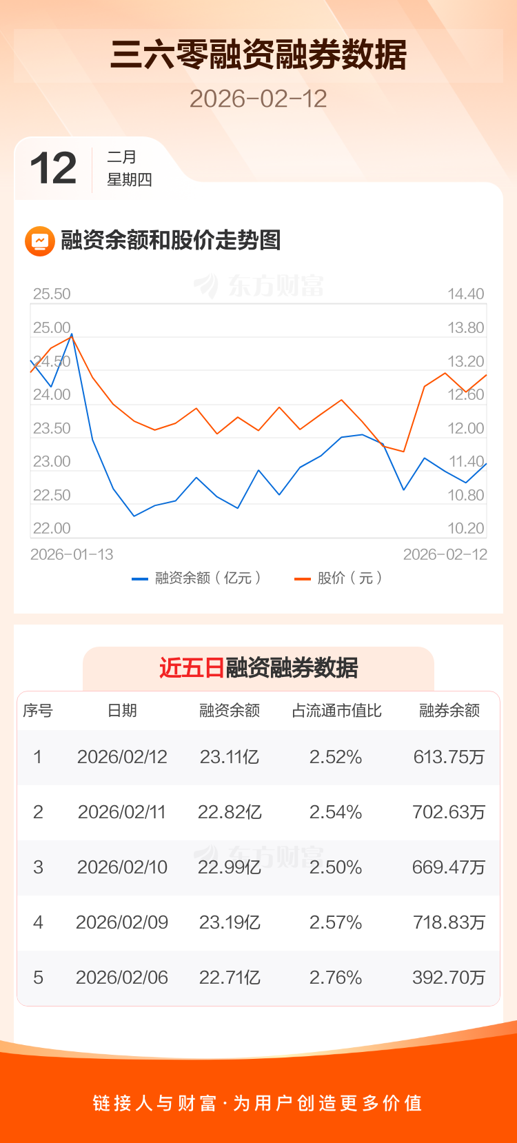 交易所最新数据显示,三六零于2026年2月12日获融资买入3.00亿元,融资偿还2.72亿元,当日融资净买入2870.67万元。目前,该股融资余额23.11亿,占流通市值比例为2.52%。