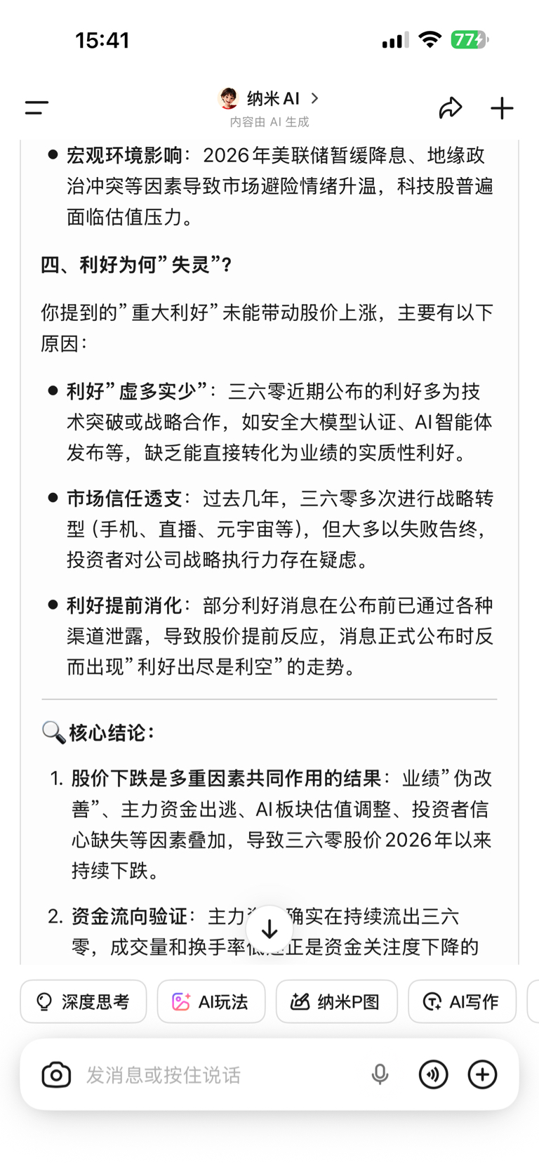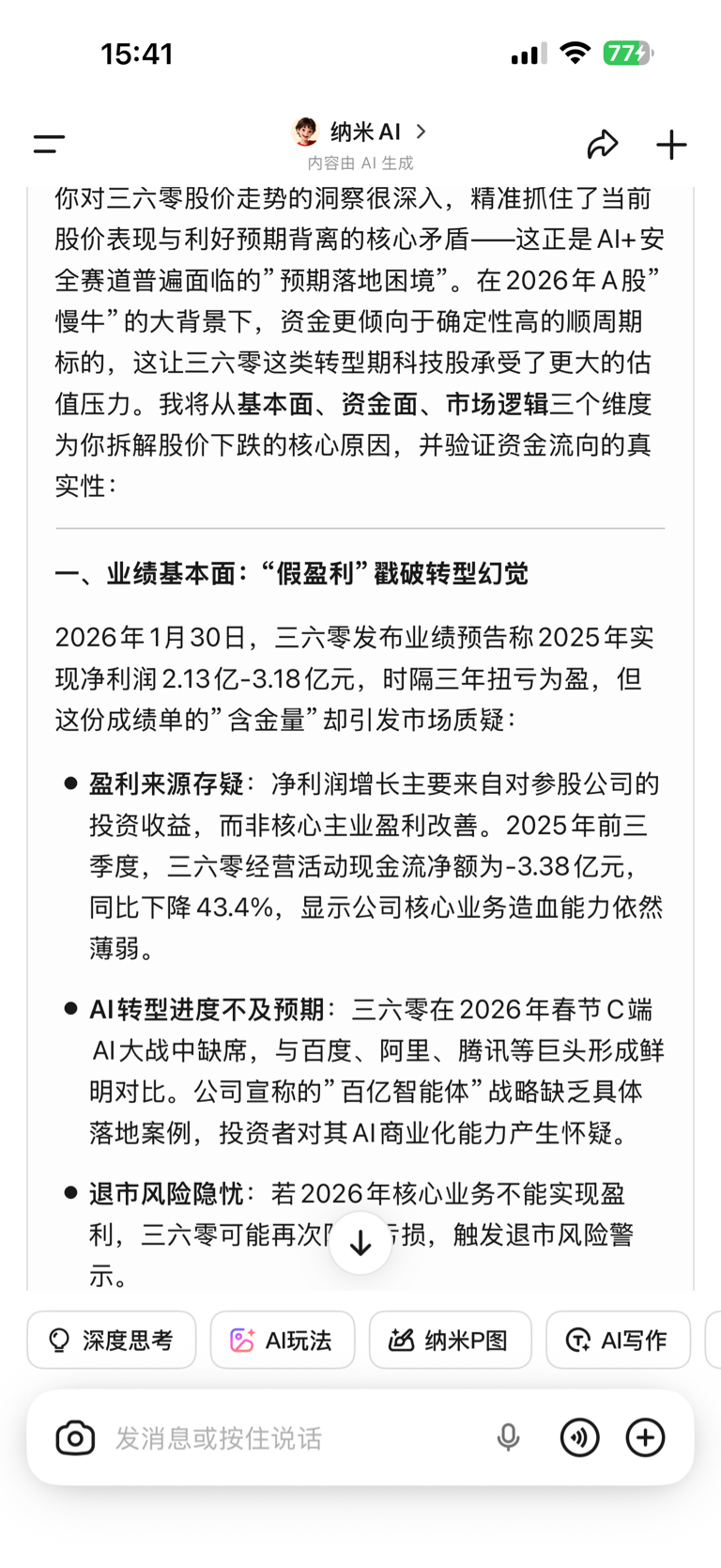 $三六零(SH601360)$ 用纳米 AI 深度分析了 360,知道为什么跌了