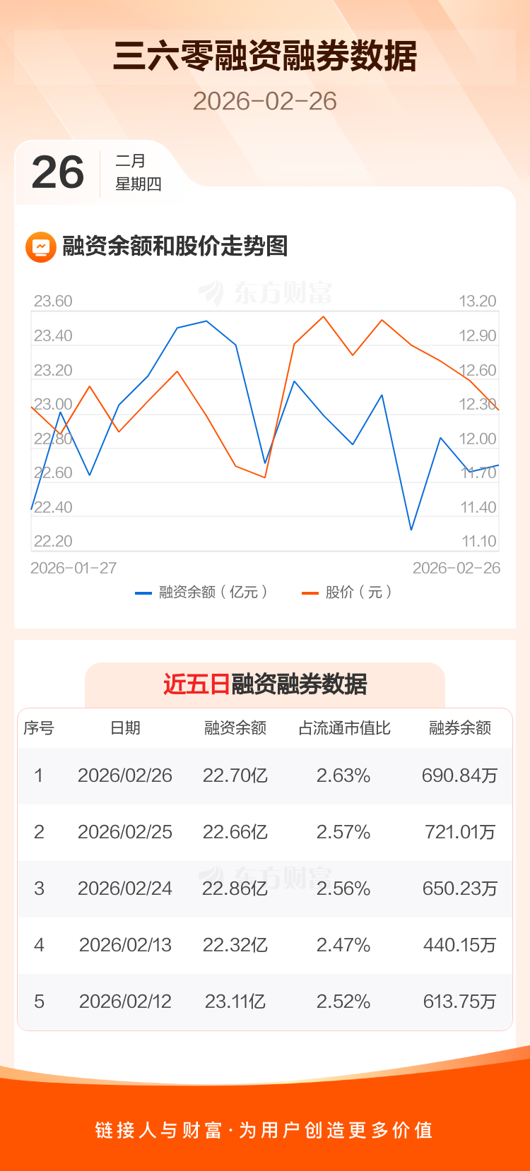 交易所最新数据显示,三六零于2026年2月26日获融资买入1.66亿元,融资偿还1.62亿元,当日融资净买入374.58万元。目前,该股融资余额22.70亿,占流通市值比例为2.63%。