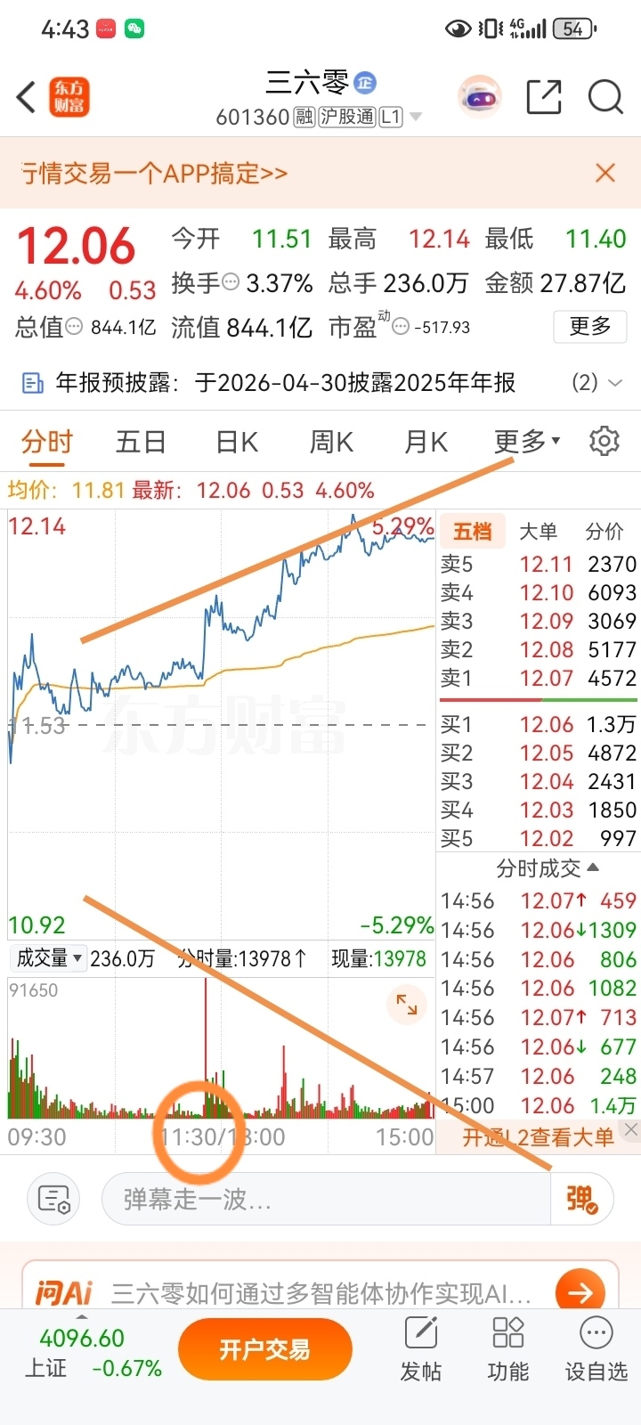 今天三六零主力是来了,可惜这么好的情绪氛围,没有拉涨停,可以从主力开拉的点看出,
