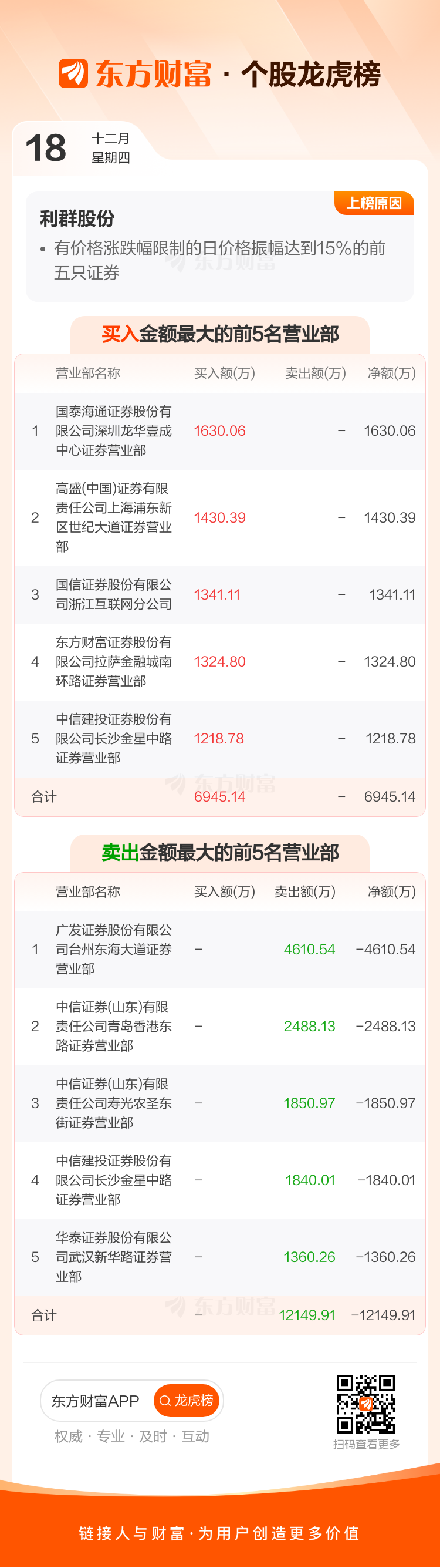 交易所2025年12月18日公布的交易公开信息显示,利群股份因成为有价格涨跌幅限制的日价格振幅达到15%的前五只证券上榜。利群股份当日收报6.04元,涨跌幅10.02%,偏离值15.93%,换手率22.19%,成交额11.73亿。
