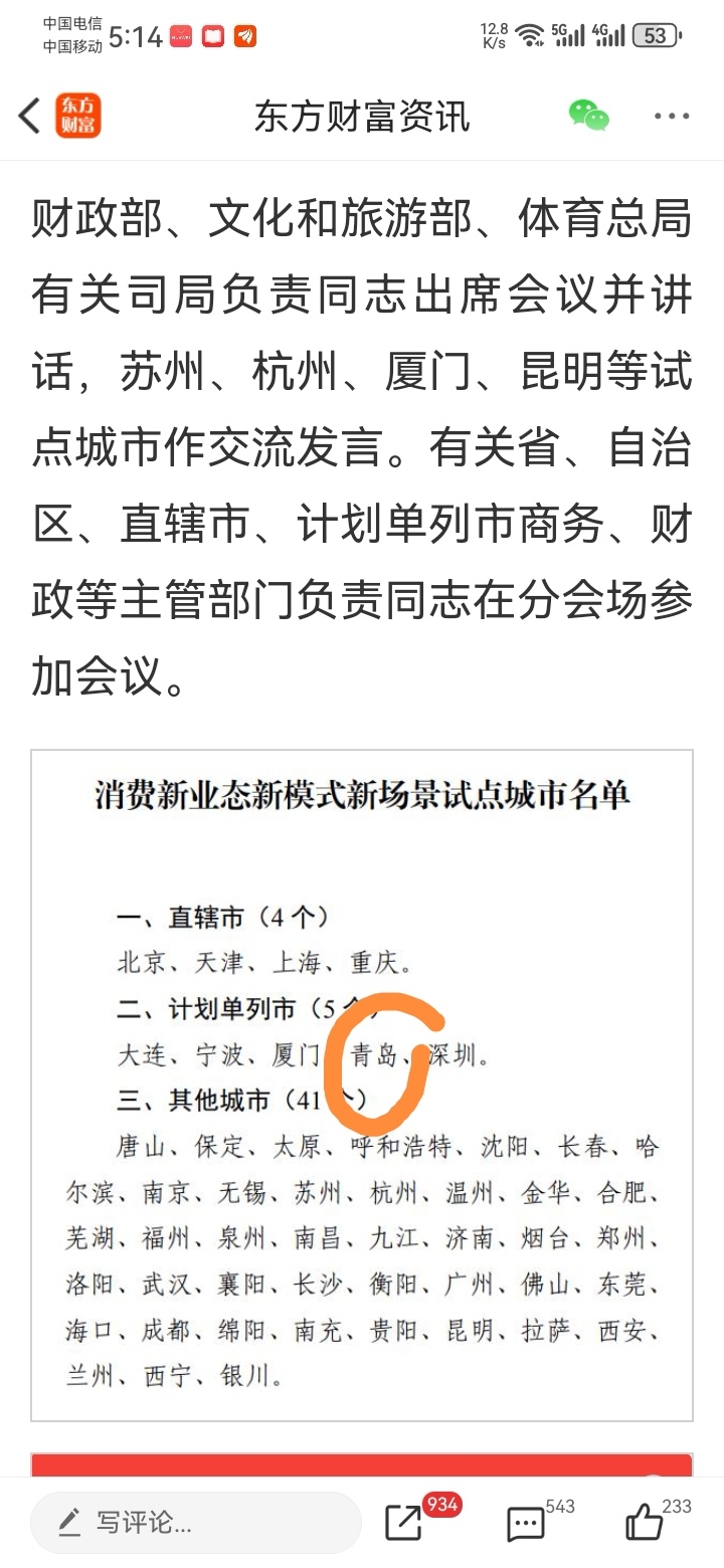 $利群股份(SH601366)$ 消费利好马上就来,全国五个试点,就有青岛