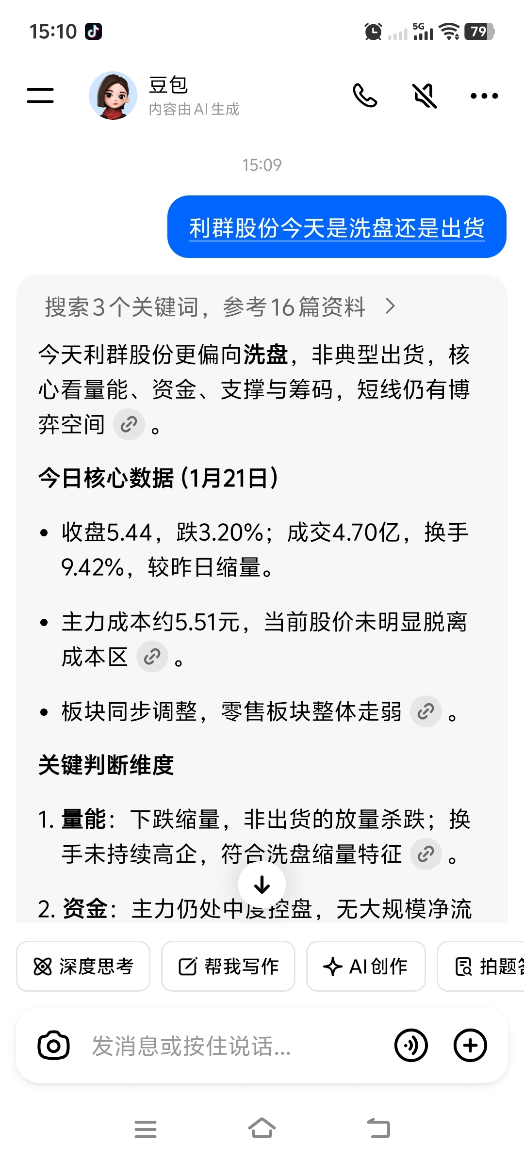 $利群股份(SH601366)$ 不管你信不信,反正我是信了,至少豆包比我更厉害吧?我发现豆包说出货的后面基本都是大跌,豆包说洗盘的后面几天还真会拉升