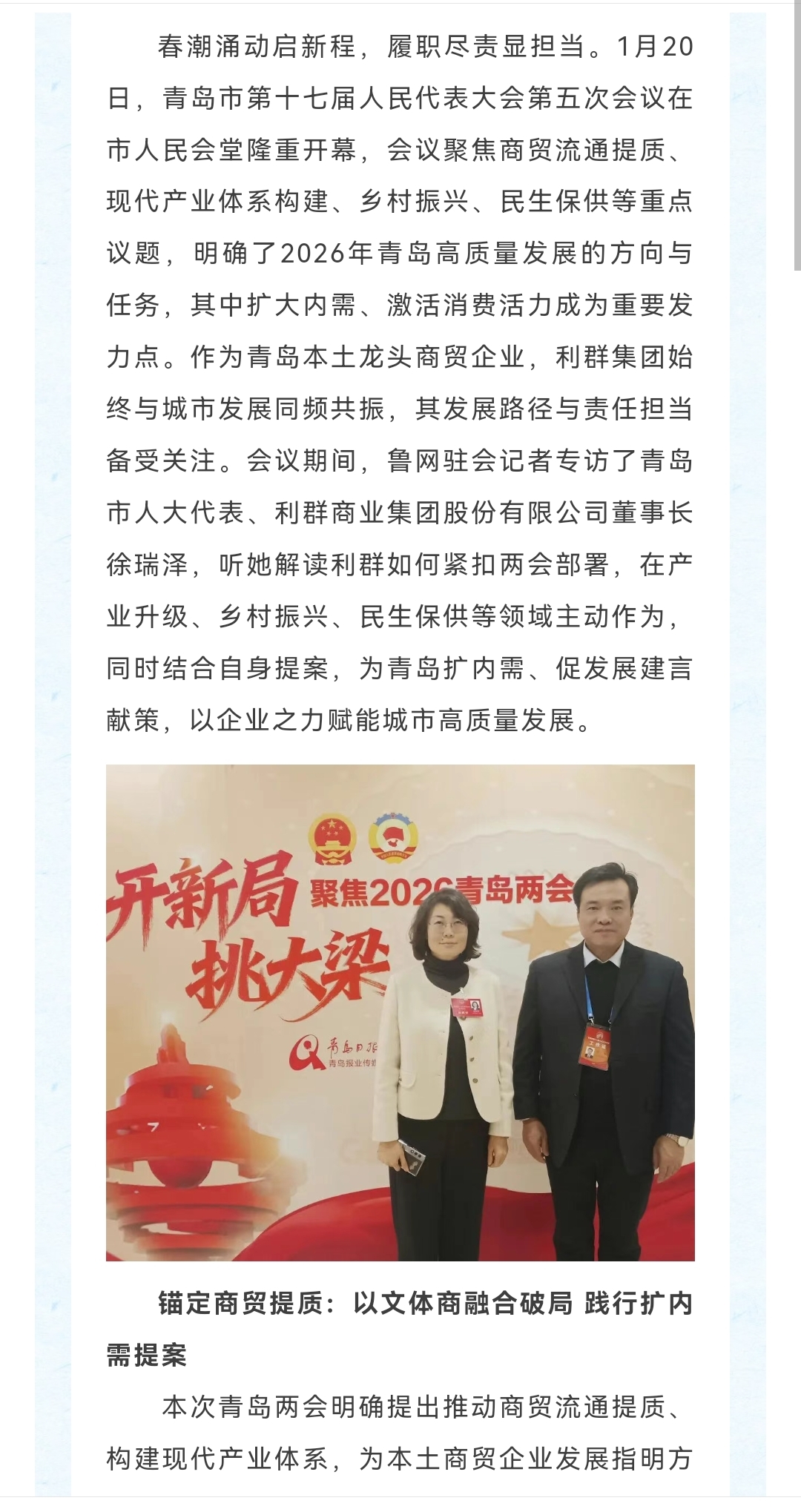 $利群股份(SH601366)$ 此次专访中,徐瑞泽的话语里满是企业担当与发展信心。未来,利群集团将持续紧扣青岛两会部署,锚定城市发展坐标,在商贸升级、乡村振兴、民生保供等领域持续发力,同时推动提案落地见效,以实干践行人大代表职责,以企业之力为青岛高质量发展绘就更加坚实的答卷。