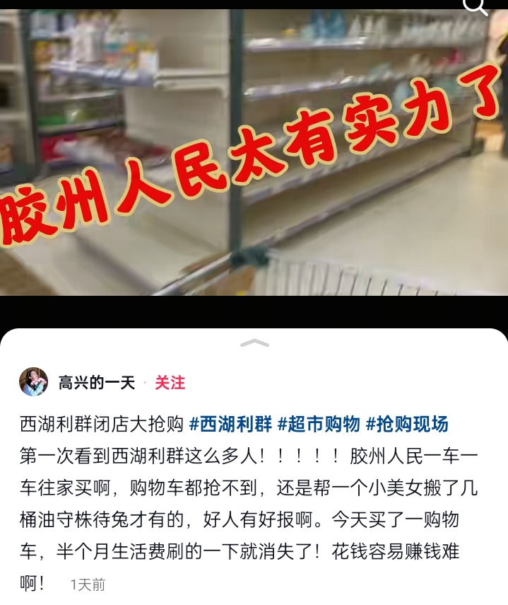 $利群股份(SH601366)$ 胶州人民太有实力了……利群超市闭店人潮涌动