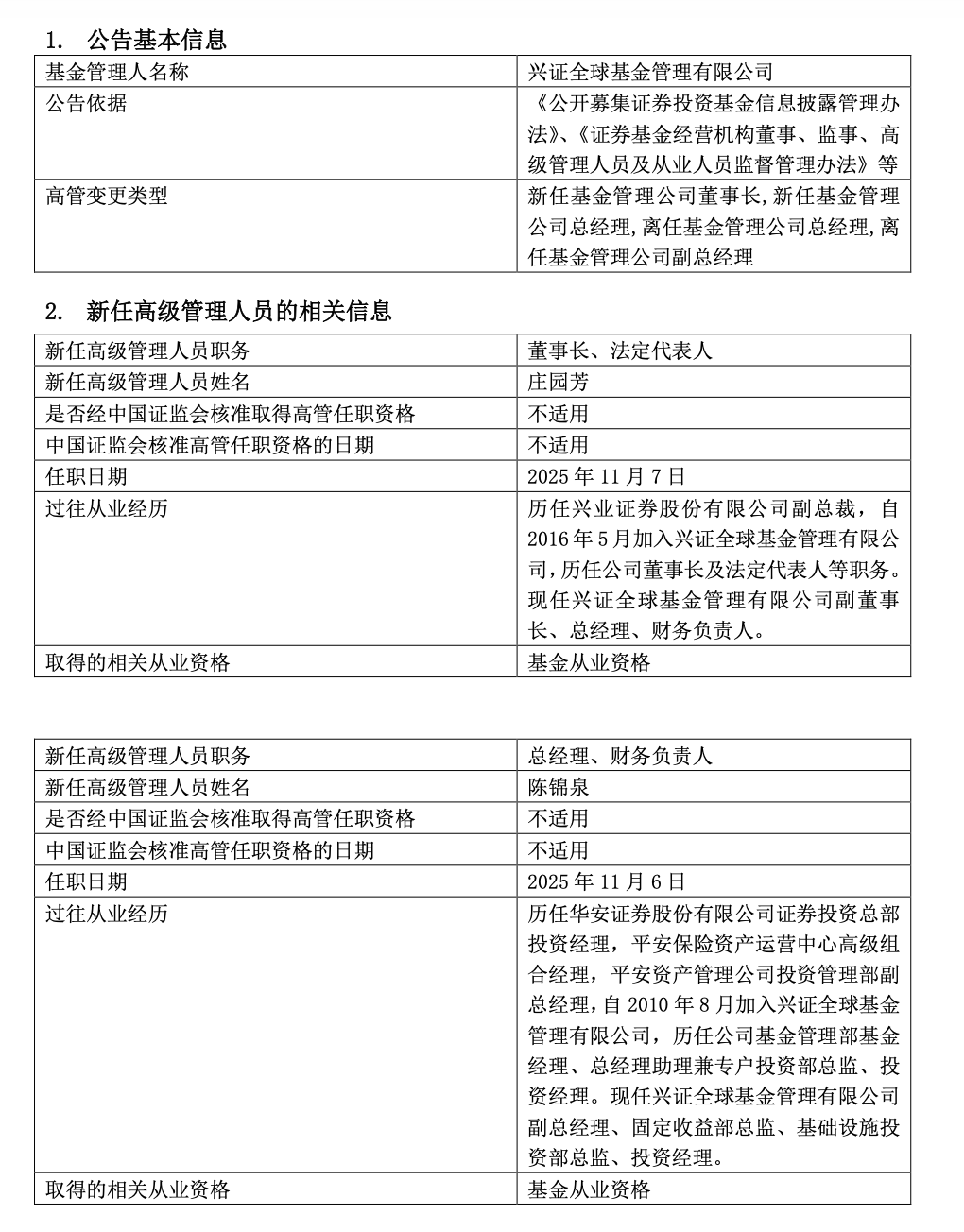 11月7日晚,兴证全球基金发布高级管理人员变更公告称,公司总经理庄园芳出任公司董事长、法定代表人,公司副总经理陈锦泉升任公司总经理,并任公司财务负责人。
