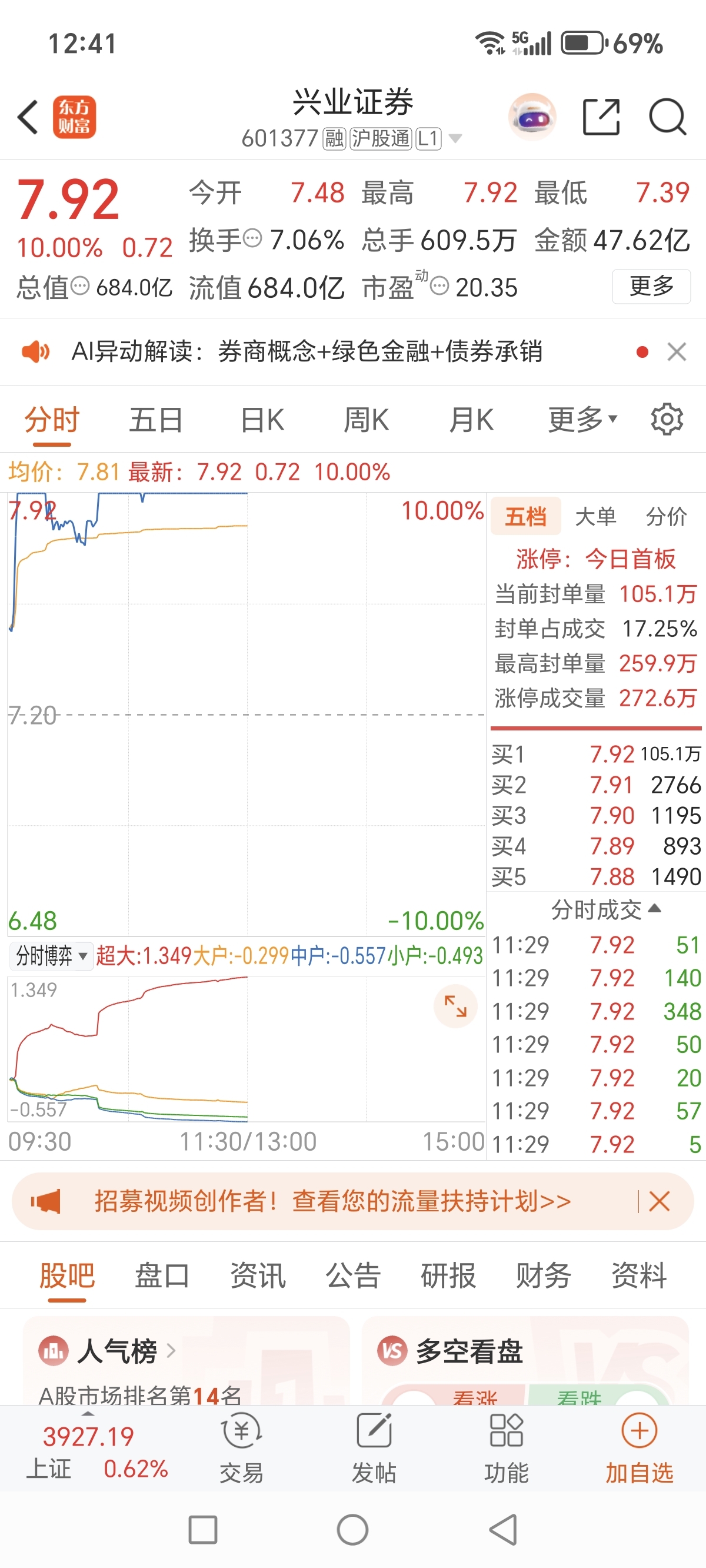 我朋友上午在兴业证券的涨停板上全仓买入了,他说他要发大财了,我真为他高兴