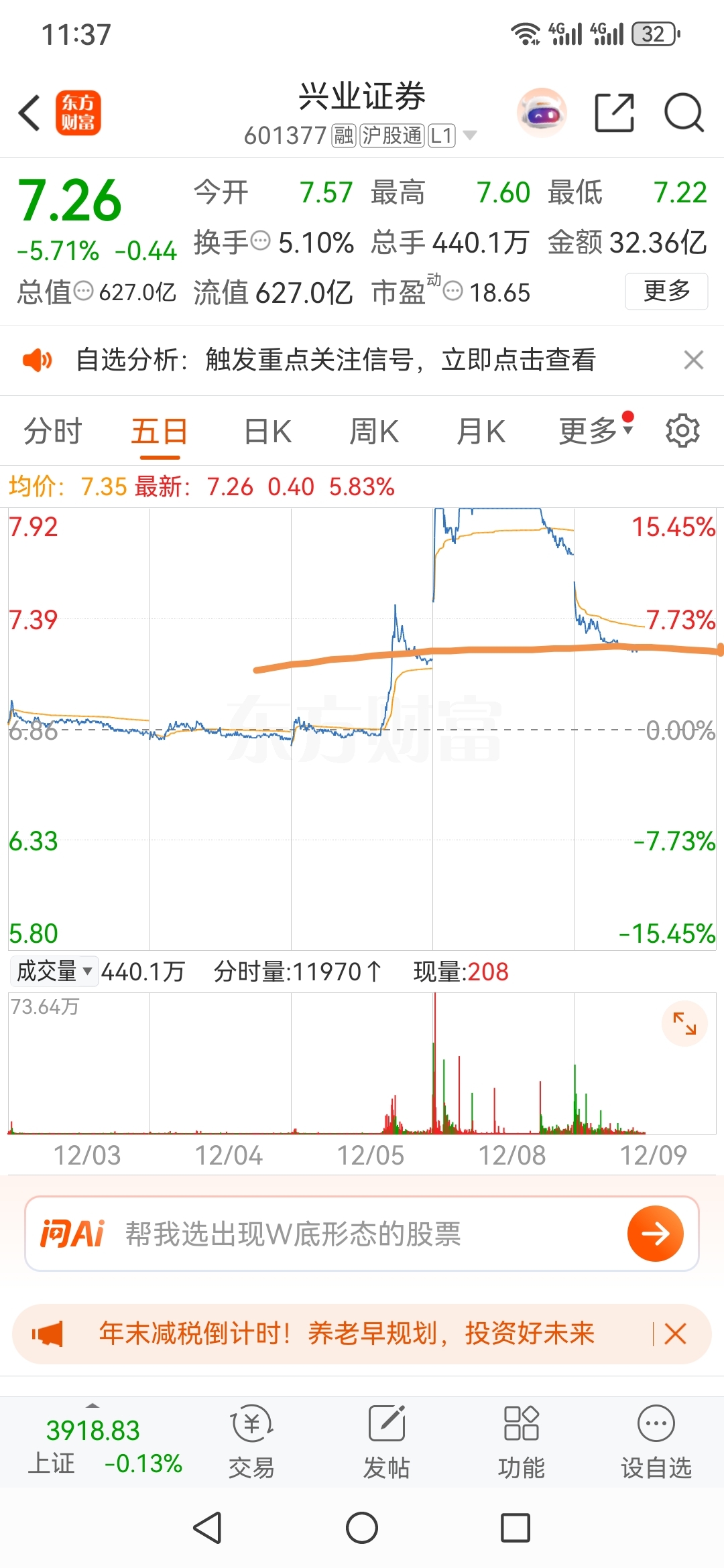 券商有业绩兜底,各项指标都是优于银行,保险,所以满仓兴业证券一定可以吃肉