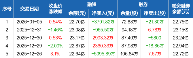 兴业证券:融资净偿还3791.82万元,融资余额22.7亿元(01-05)