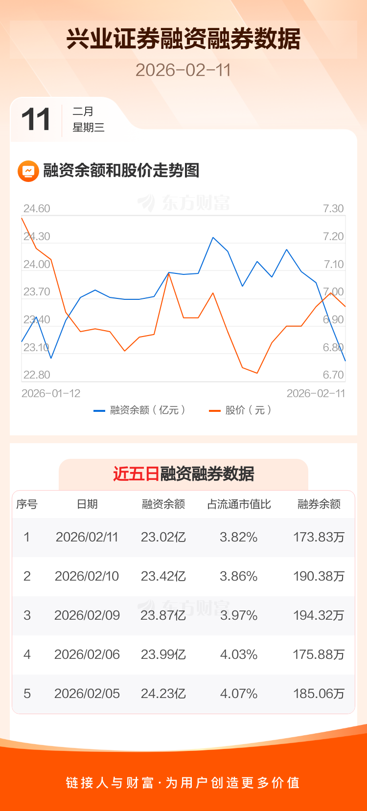 交易所最新数据显示,兴业证券于2026年2月11日获融资买入3835.16万元,融资偿还7904.73万元,当日融资净偿还4069.57万元。目前,该股融资余额23.02亿,占流通市值比例为3.82%。