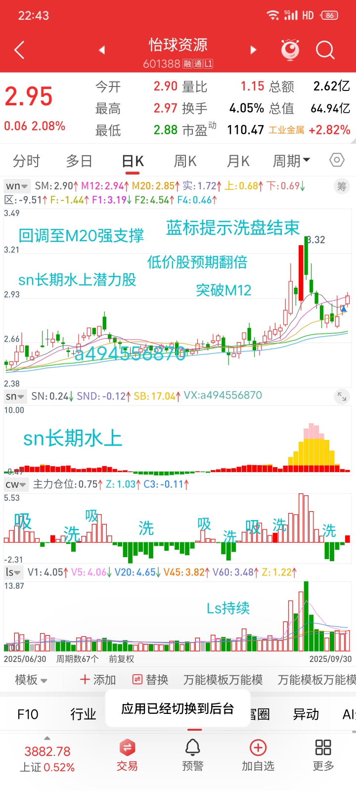 $怡球资源(SH601388)$ 主图出现了蓝标提示洗盘结束啦。股价向下回踩M20,向上突破M12。非常好的走势。sn持续水上,cw开始向上反转。