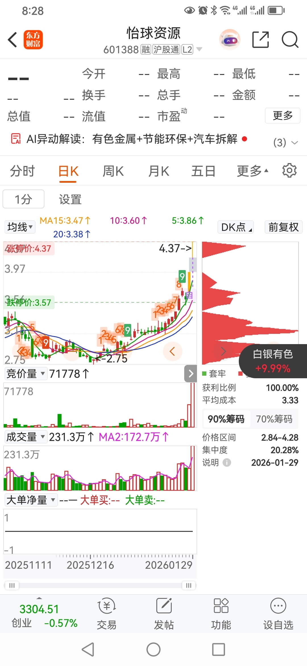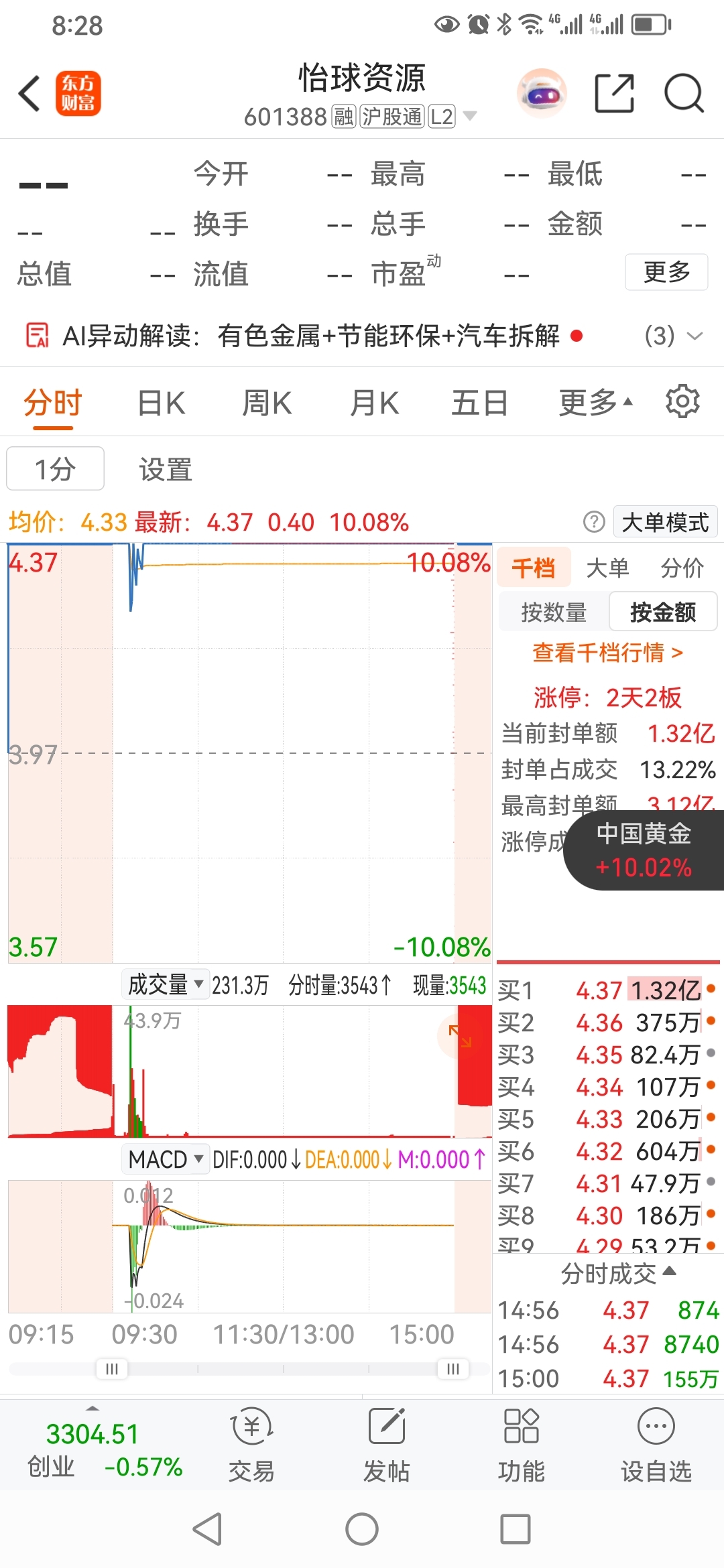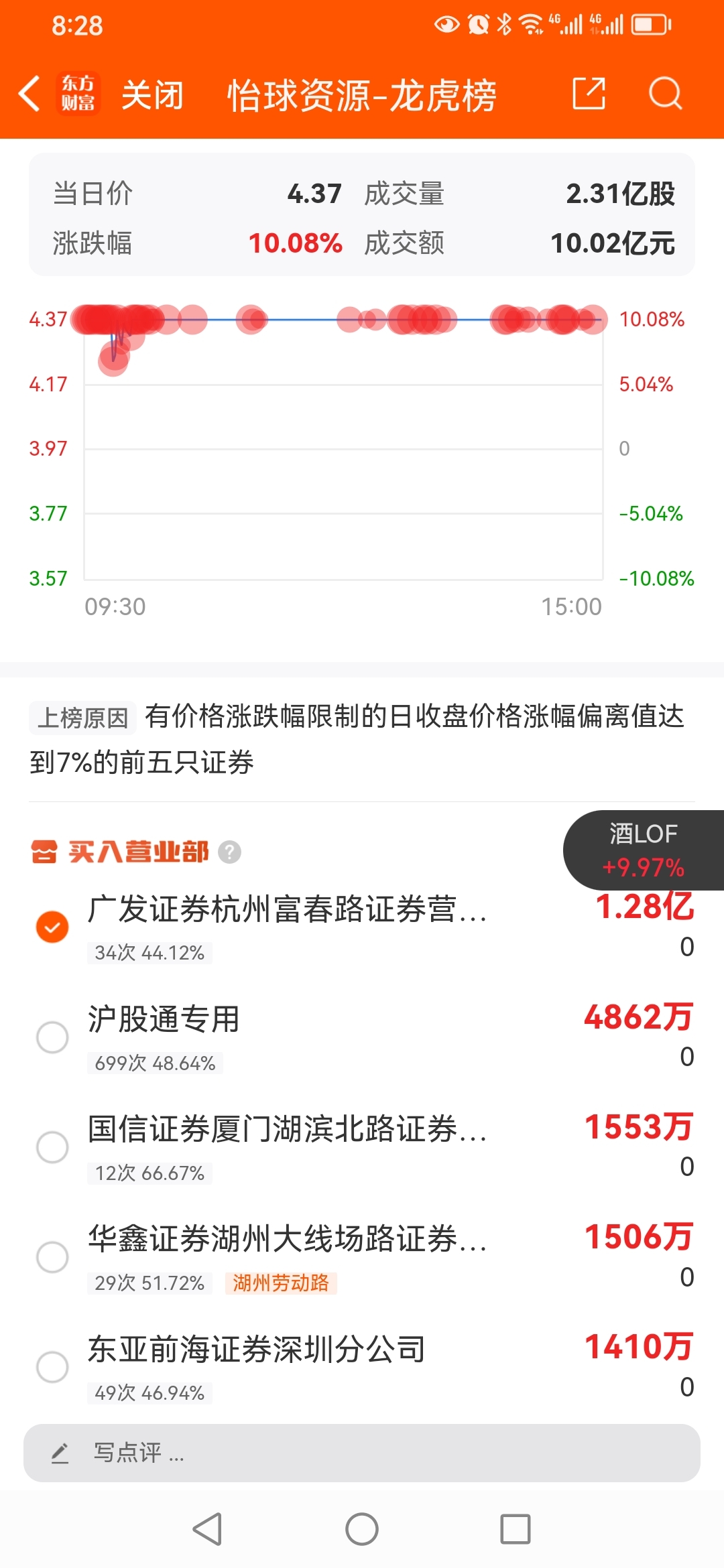 2月2日,炒股冠军方军老师股票,怡球资源,龙虎榜买进1000万。
