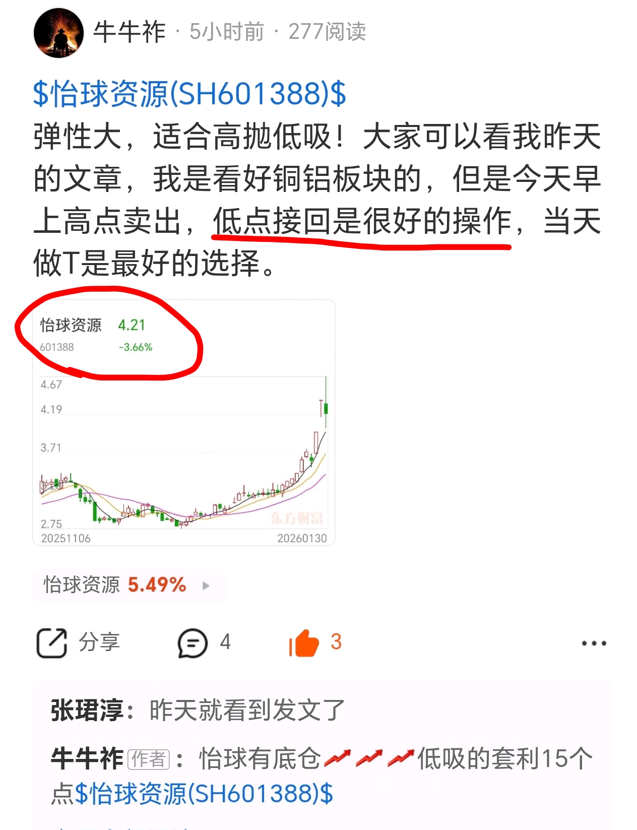 $怡球资源(SH601388)$ 前天发文分析,今天板块分歧时,其他都按地板了,就他还冲高6个点,虽然冲高回落但支撑位承接不错,所以午盘顶着压力,提示高抛低吸的机会,还被人说马后炮。认真看我发文的,都应该是感谢的。