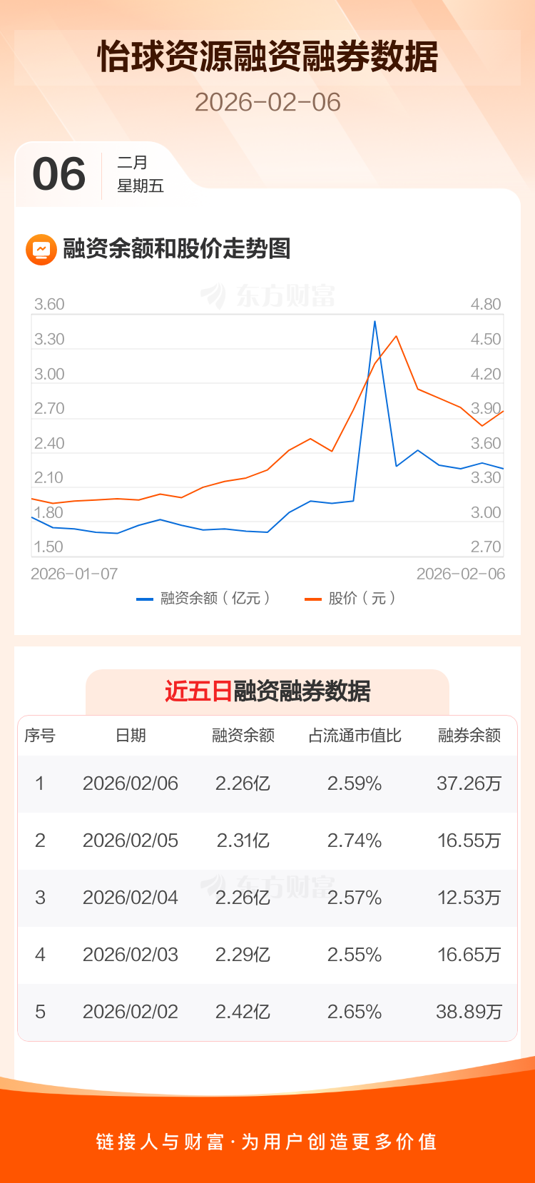 交易所最新数据显示,怡球资源于2026年2月6日获融资买入4034.43万元,融资偿还4580.20万元,当日融资净偿还545.77万元。目前,该股融资余额2.26亿,占流通市值比例为2.59%。