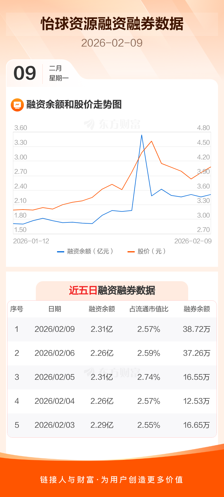 交易所最新数据显示,怡球资源于2026年2月9日获融资买入4106.71万元,融资偿还3551.30万元,当日融资净买入555.4万元。目前,该股融资余额2.31亿,占流通市值比例为2.57%。