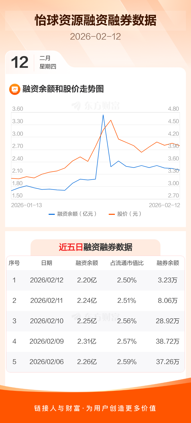 交易所最新数据显示,怡球资源于2026年2月12日获融资买入1758.20万元,融资偿还2162.71万元,当日融资净偿还404.51万元。目前,该股融资余额2.20亿,占流通市值比例为2.50%。