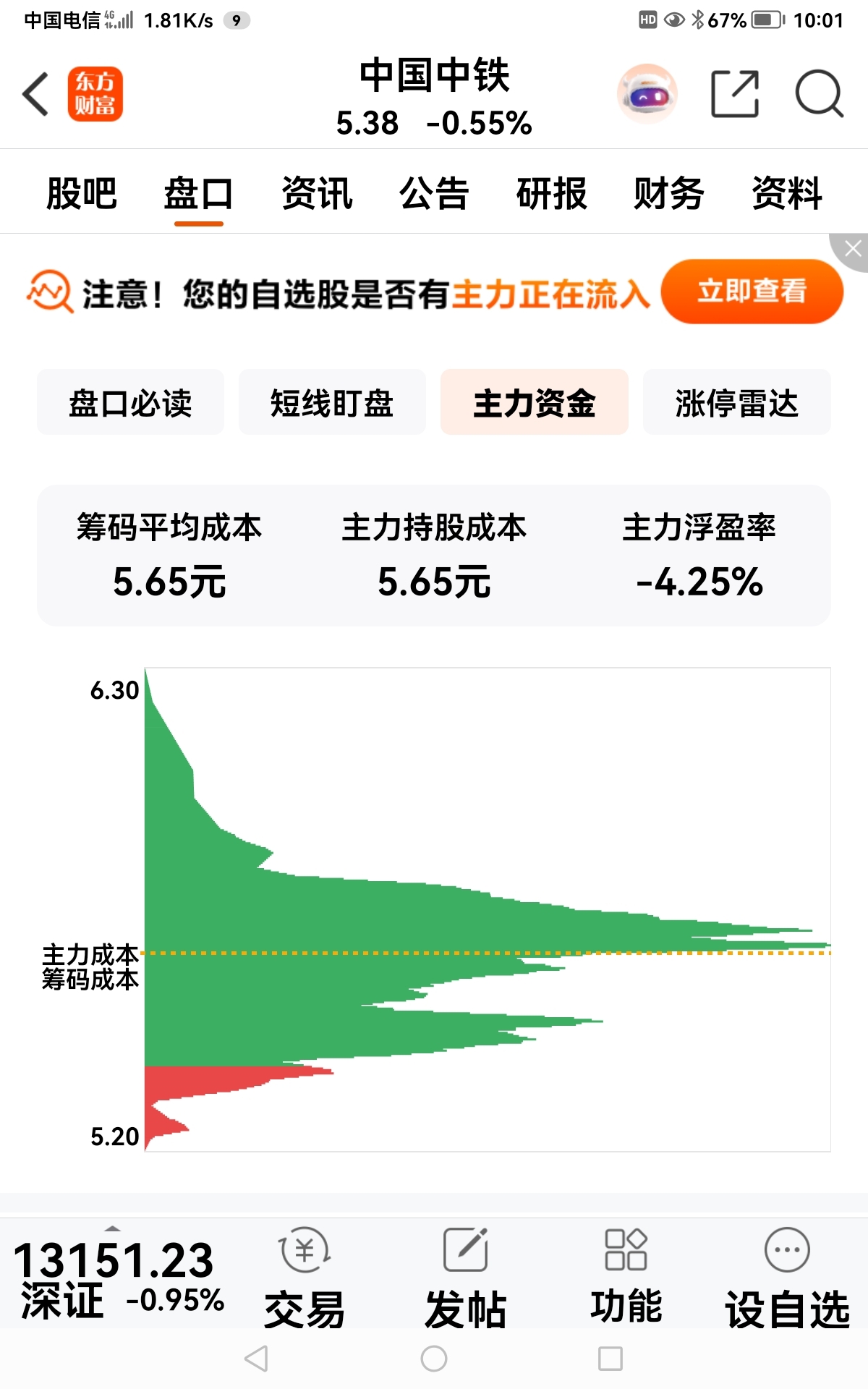 $中国中铁(SH601390)$ 看筹码峰,主力成本,有大部分主力也被套进不去了,看MA,周K大阳后,日K几十个交易日前的猛涨,今天才到底,从明天应该反功了。不知我分析的对否?