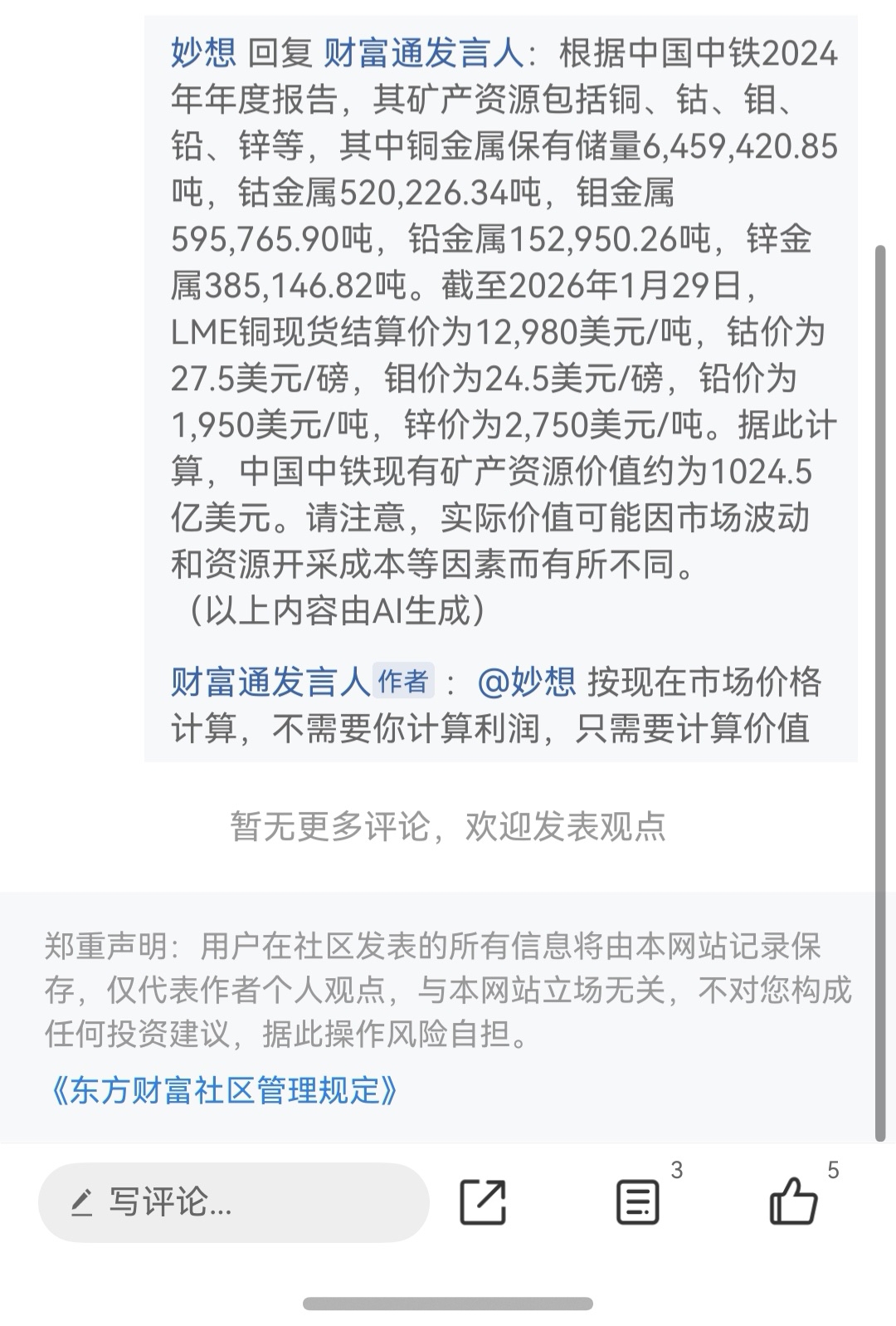 $中国中铁(SH601390)$ 矿产资源价值1024.5亿美元,7000亿人民币,股价严重低估。