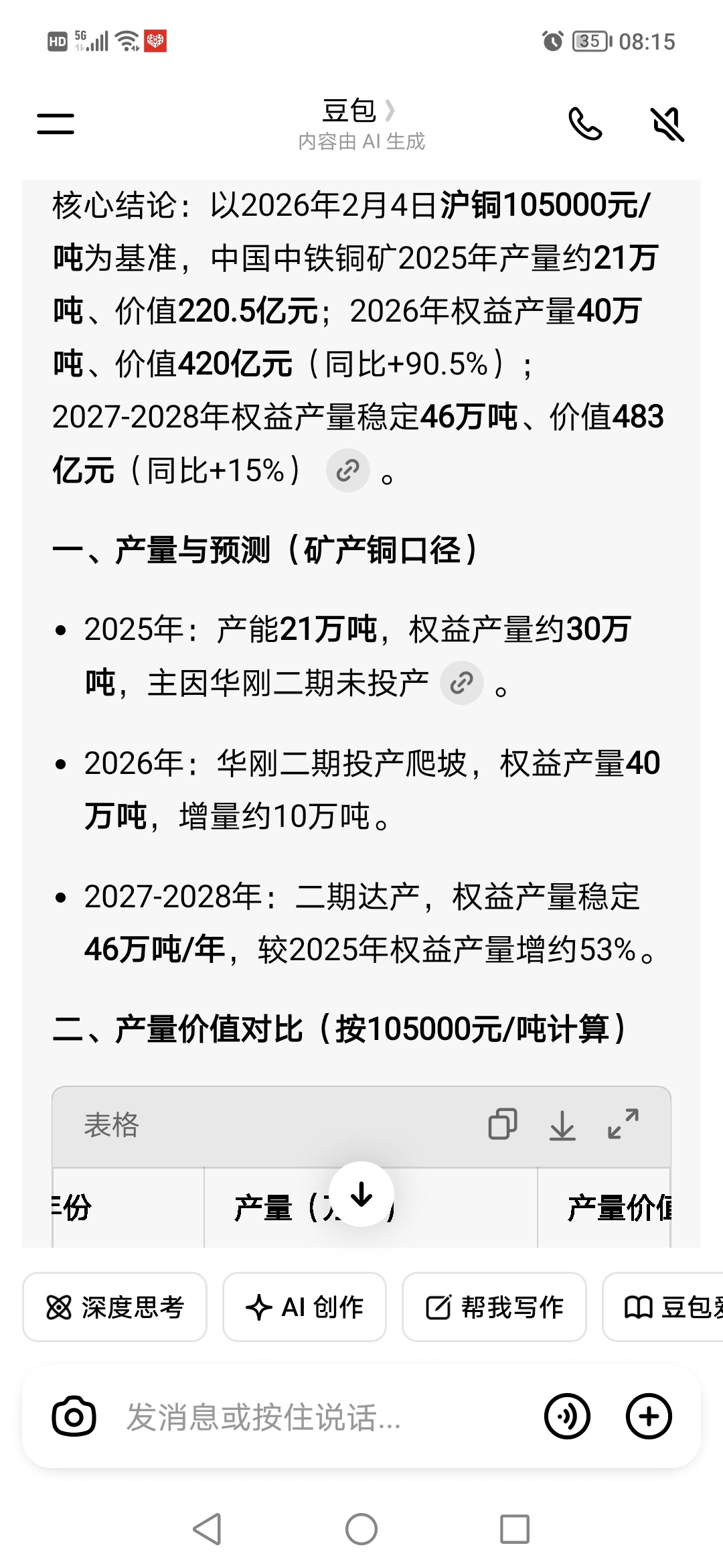 以2026年2月4日沪铜105000元/吨为基准,中国中铁铜矿2025年产量约2
