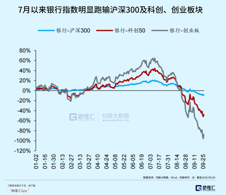 然而银行板块却走出了截然不同的行情,自7月开启调整模式至今,38家上市银行已集体连跌了三月。其中,民生银行、华夏银行、光大银行、北京银行等近十股期间累计回调超过20%,中证银行指数累计回撤15%,与同期沪深300指数等主要指数的亮眼表现形成鲜明反差。