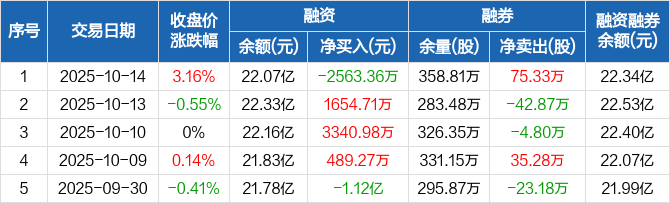 融资方面,当日融资买入3.6亿元,融资偿还3.86亿元,融资净偿还2563.36万元。融券方面,融券卖出79.01万股,融券偿还3.68万股,融券余量358.81万股,融券余额2691.05万元。融资融券余额合计22.34亿元。