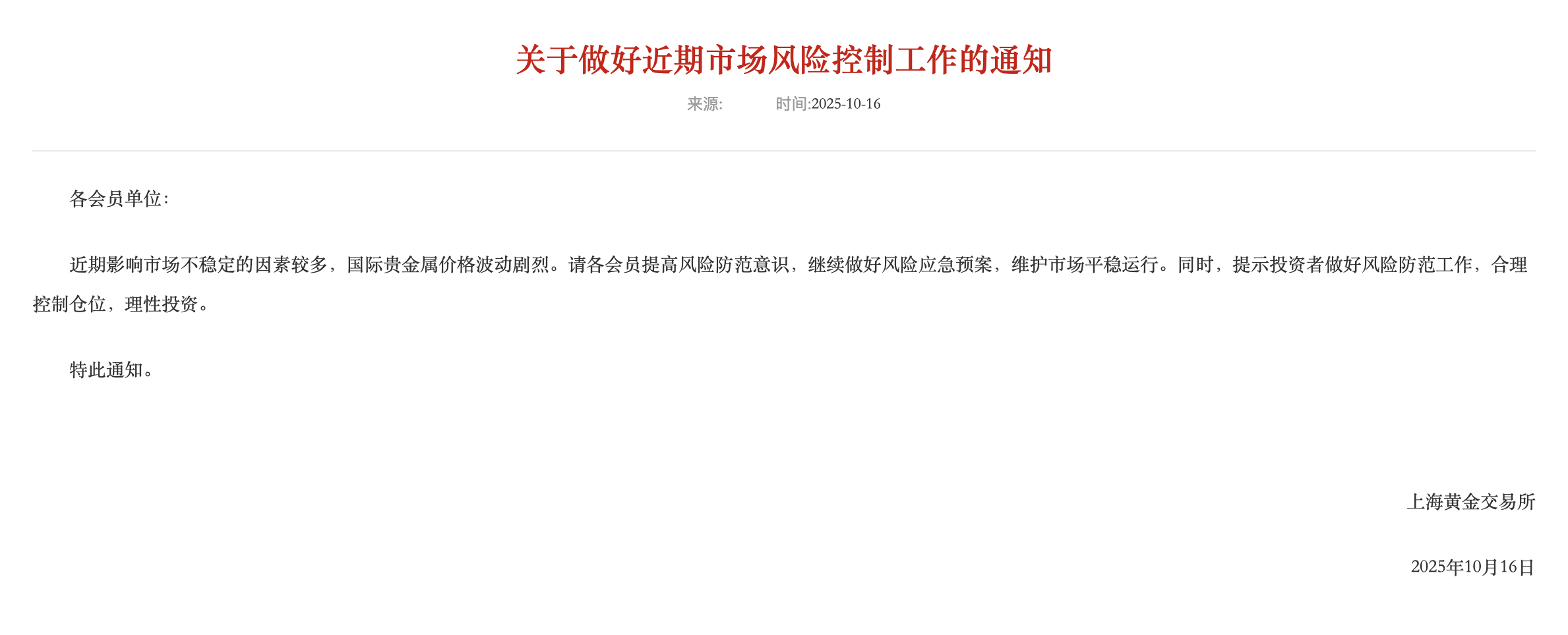 同一日,上海黄金交易所向各会员单位发布《关于做好近期市场风险控制工作的通知》。《通知》明确,近期影响市场不稳定的因素较多,国际贵金属价格波动剧烈。请各会员提高风险防范意识,继续做好风险应急预案,维护市场平稳运行。同时,提示投资者做好风险防范工作,合理控制仓位,理性投资。