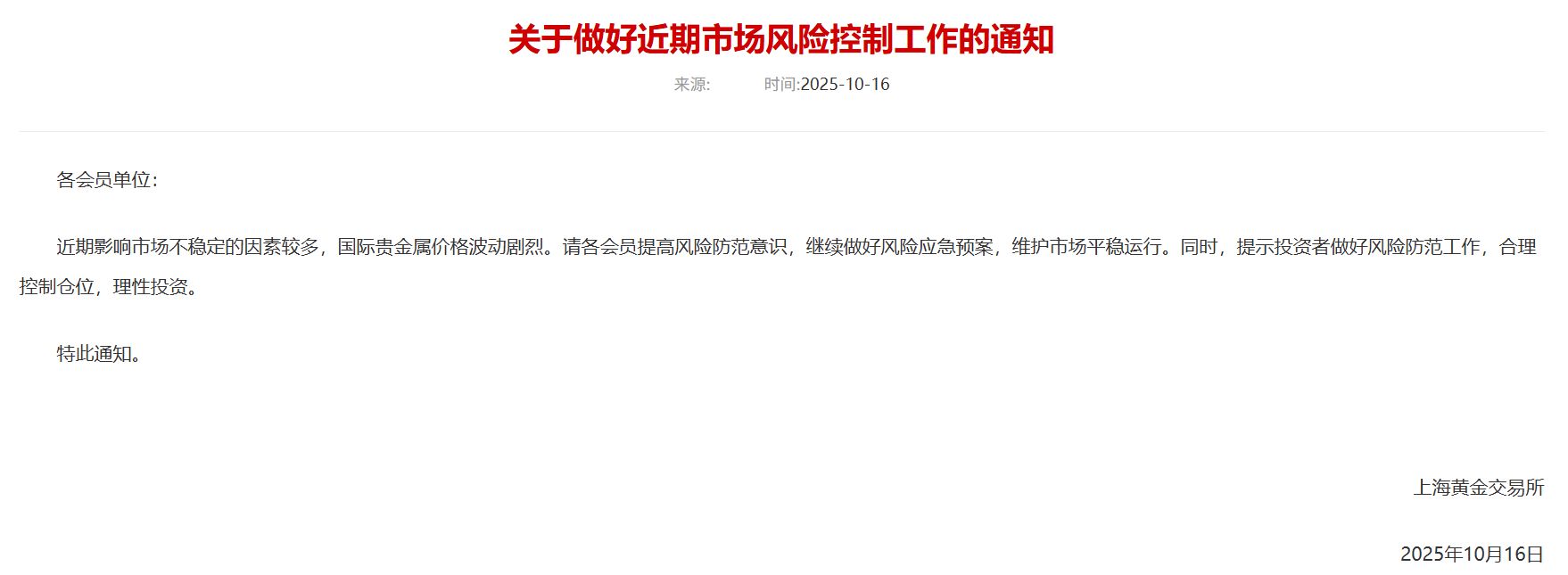 10月16日,上海黄金交易所在网站发布提示,近期影响市场不稳定的因素较多,国际贵金属价格波动剧烈。请各会员提高风险防范意识,继续做好风险应急预案,维护市场平稳运行。同时,提示投资者做好风险防范工作,合理控制仓位,理性投资。