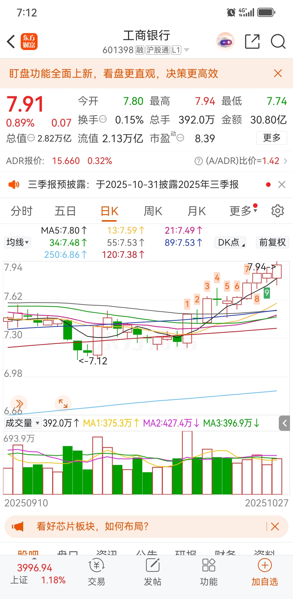 $工商银行(SH601398)$ 这波冲4000的行情,宇宙行是主力中的主力,必破前期8.2的历史新高,所以耐心持有不要过早的被甩下车