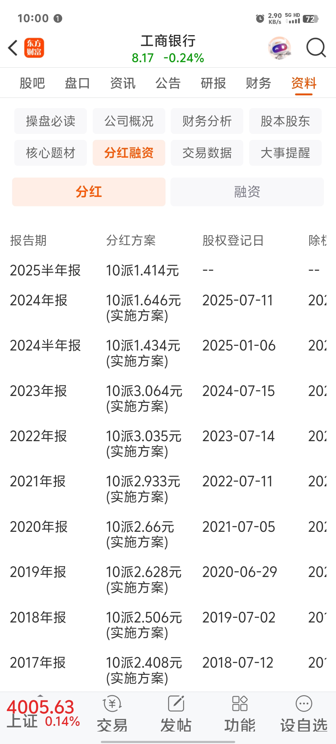 过去工商银行的分红最高在7%左右,现在降了一半了,还有3.85%。对于存银行吃息的来说,这分红也是不少。