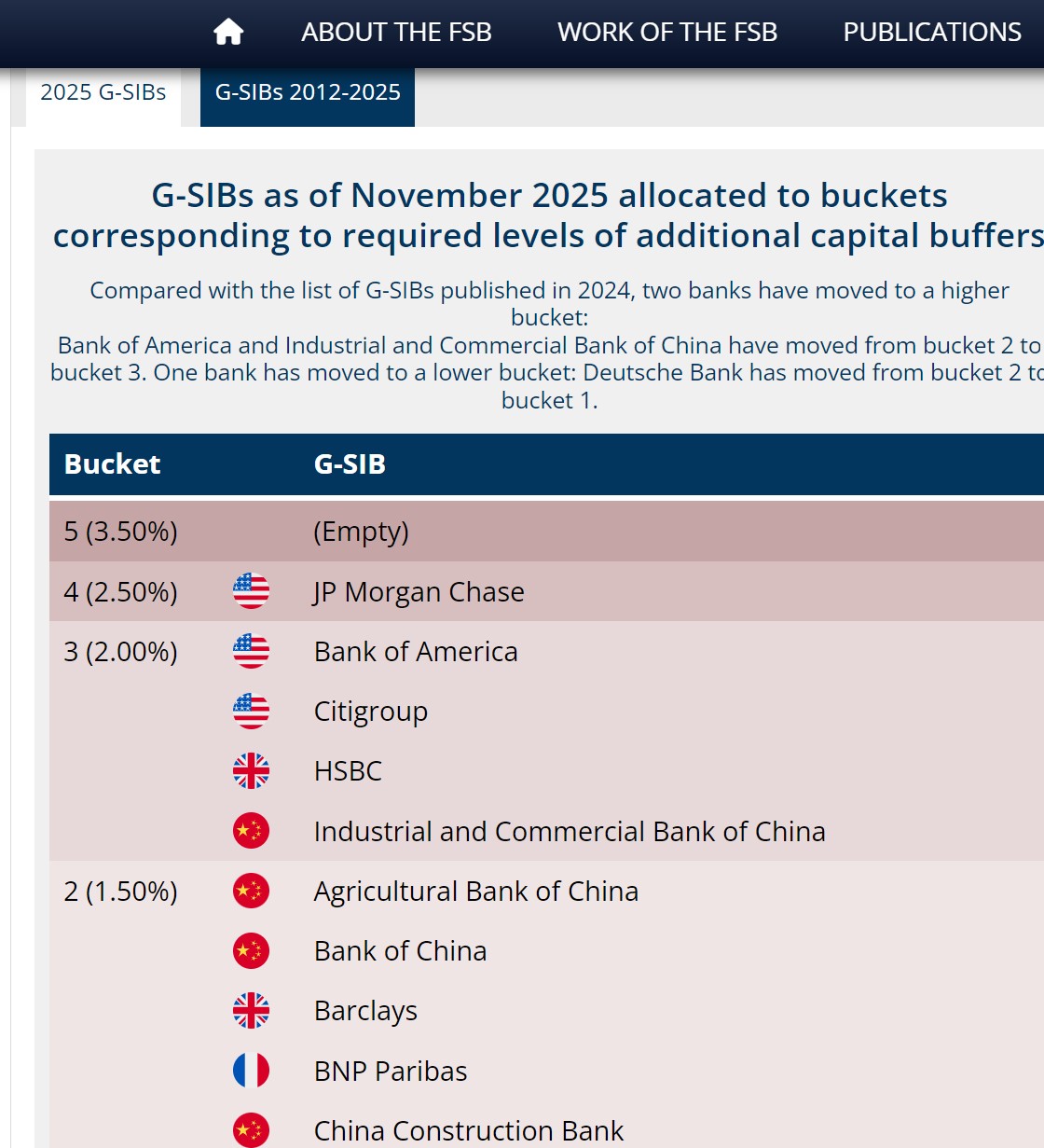 当地时间11月27日,总部位于瑞士巴塞尔的金融稳定理事会(FSB)发布2025年全球系统重要性银行(G-SIBs)名单。