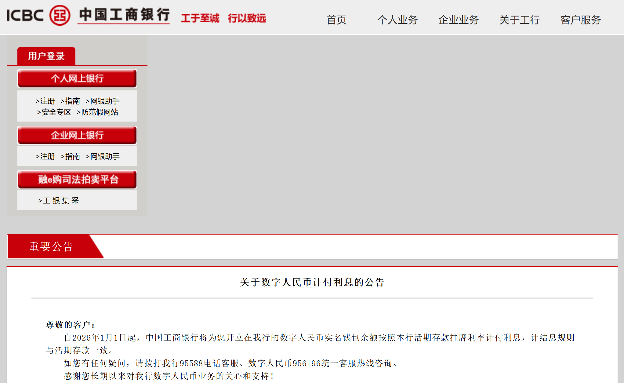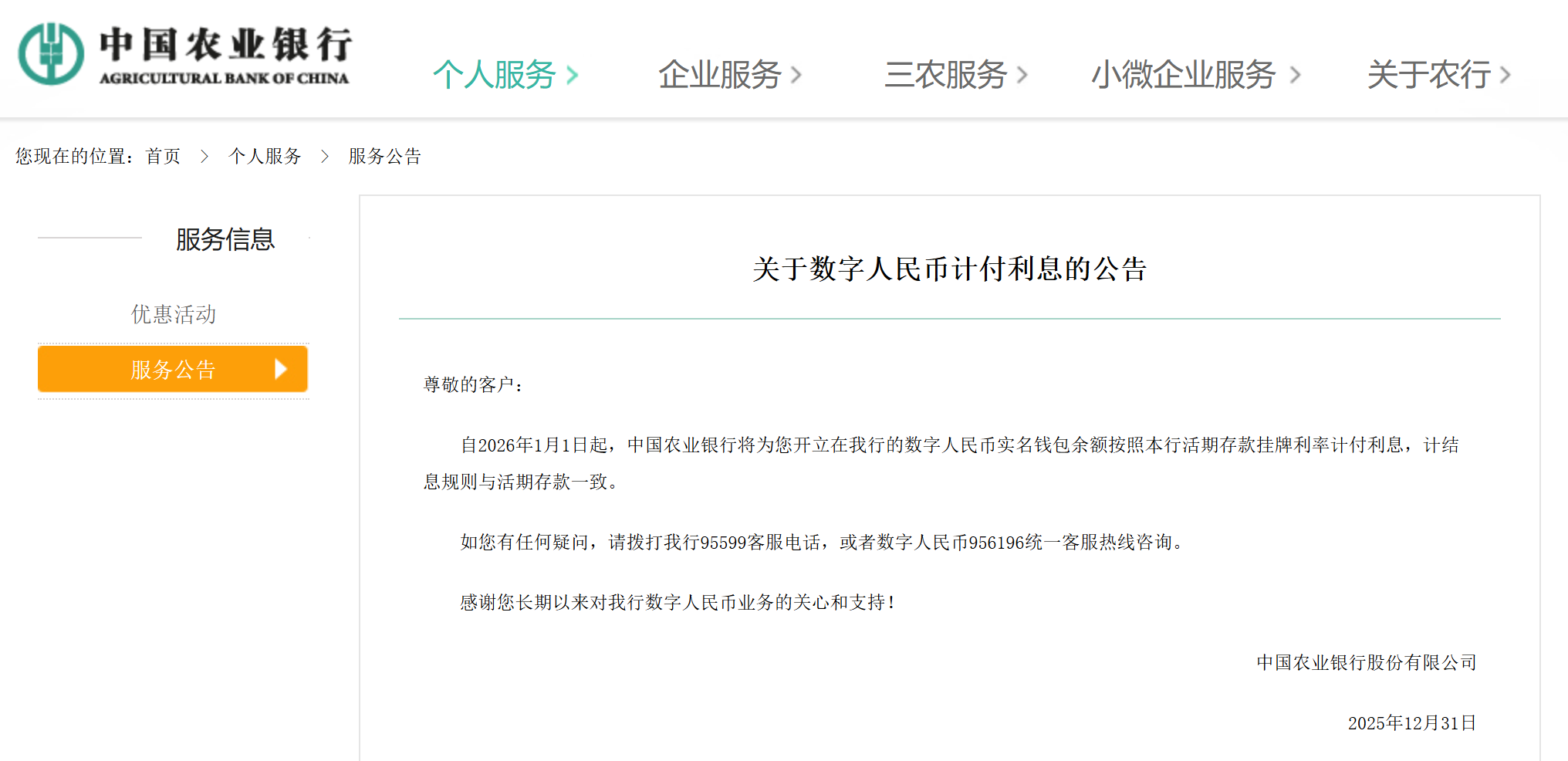 工行、农行:2026年1月1日起为数字人民币实名钱包余额计付利息