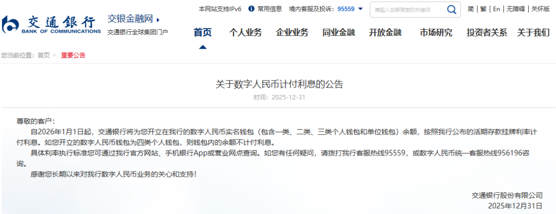 其中,交通银行表示,自2026年1月1日起,该行将为客户开立在该行的数字人民币实名钱包(包含一类、二类、三类个人钱包和单位钱包)余额,按照该行公布的活期存款挂牌利率计付利息。交通银行官网显示,该行活期存款利率为0.05%。