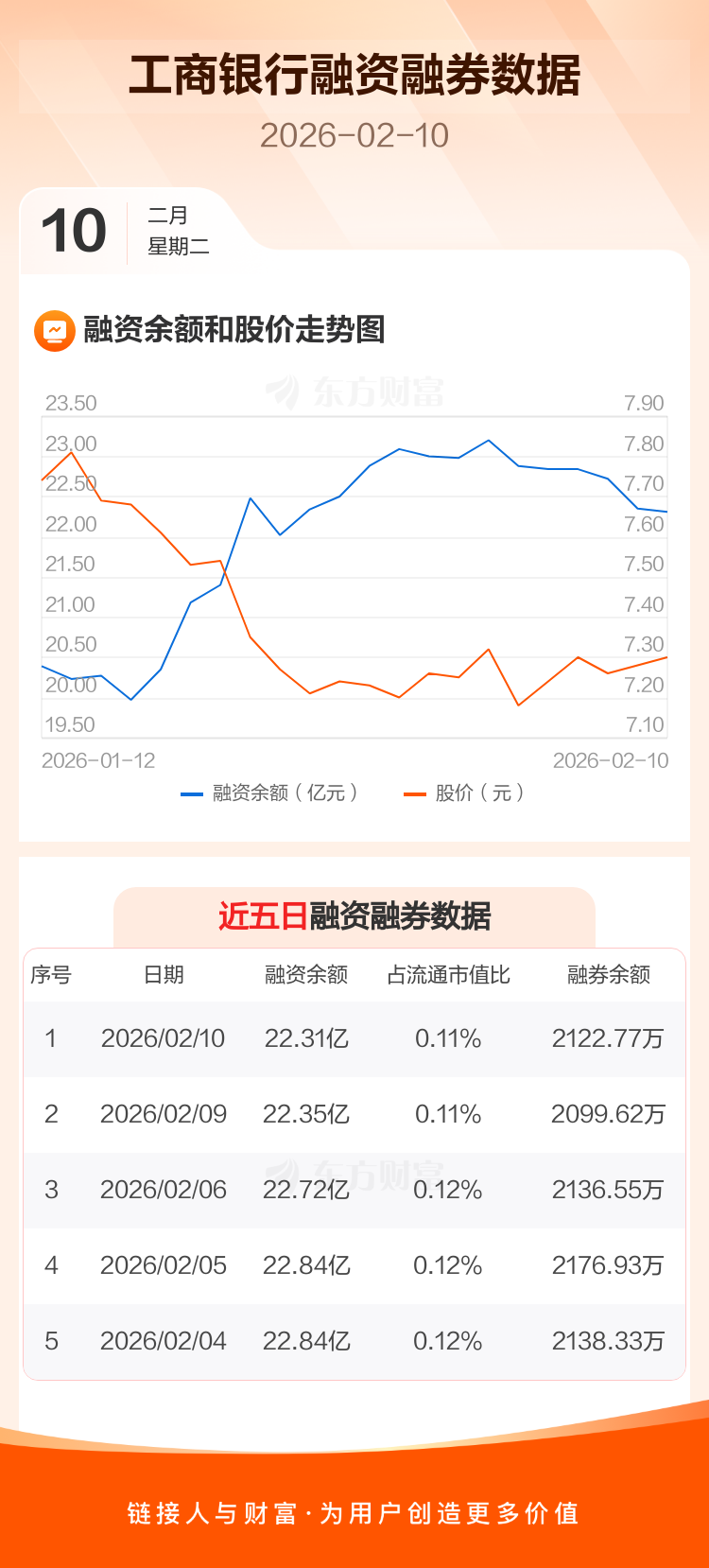 交易所最新数据显示,工商银行于2026年2月10日获融资买入9295.83万元,融资偿还9693.22万元,当日融资净偿还397.39万元。目前,该股融资余额22.31亿,占流通市值比例为0.11%。