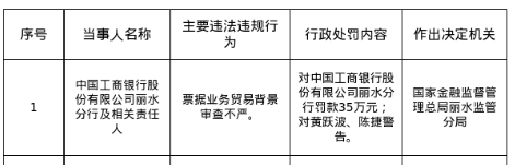 工行丽水分行被罚35万,涉票据业务贸易背景审查不严