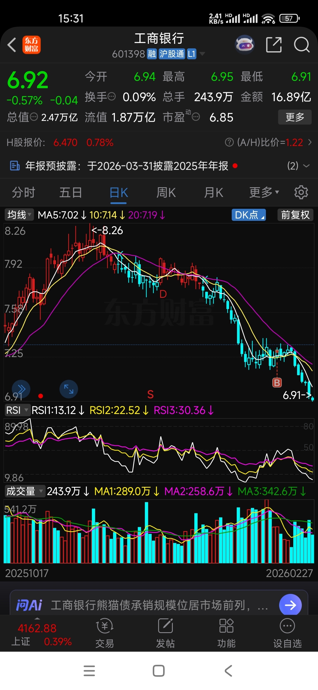 $工商银行(SH601398)$ 兄弟们,不好意思不好意思,买了一手而已,就买跌了!