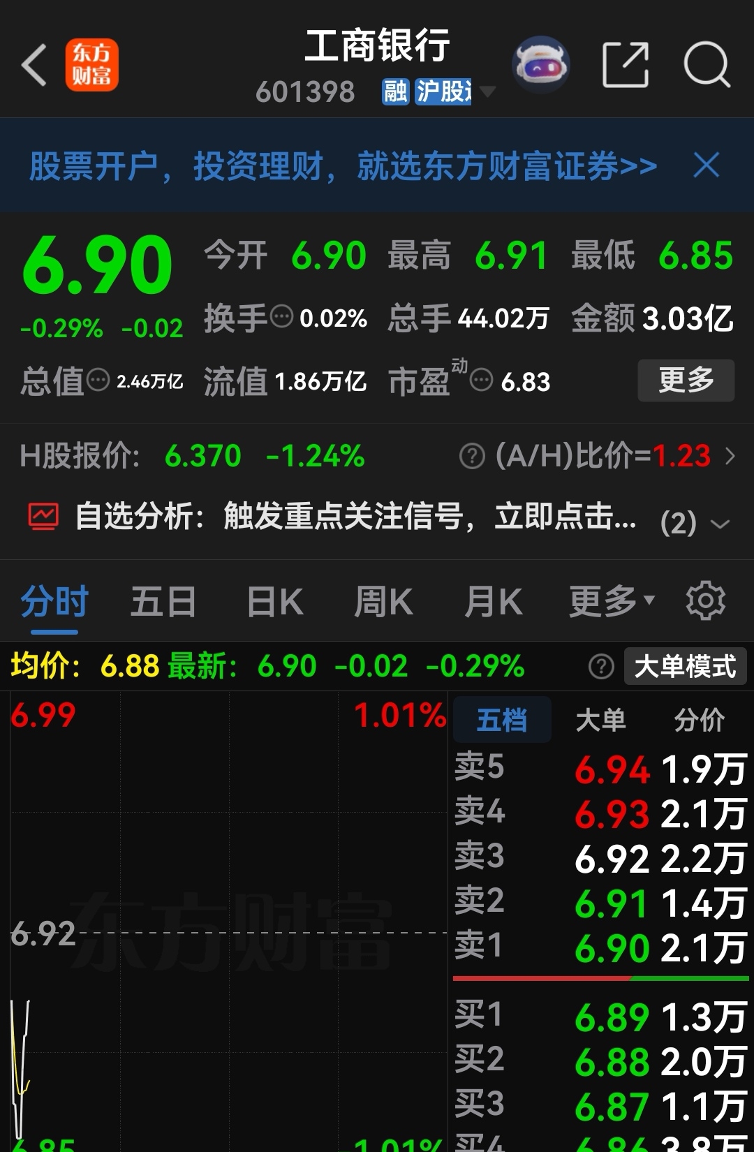 以6.88挂单买入工啇银行,此时此价买进是不是买点高了点,真希望能继续下跌,能多