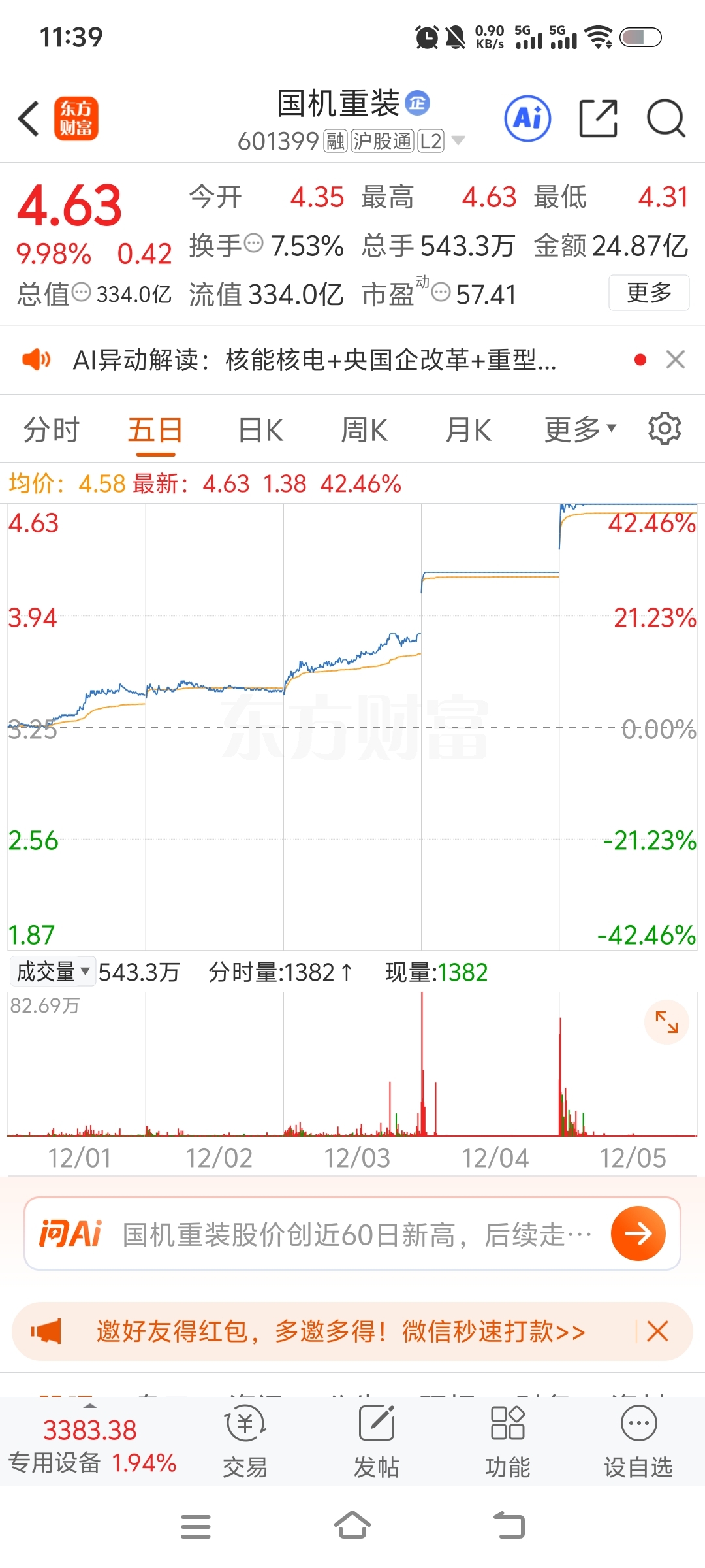 $国机重装(SH601399)$ 新城路就是主力拉来的先锋队,一天净买入2.93亿一年只有一次,中间可能有回调,12月底你在看股价绝对在天上。敢说做T的没一个是赚钱的一天天自作聪明,4号5号拉上去根本就不带回调的,散户还想做T,主力都恨不得板上吃货了。