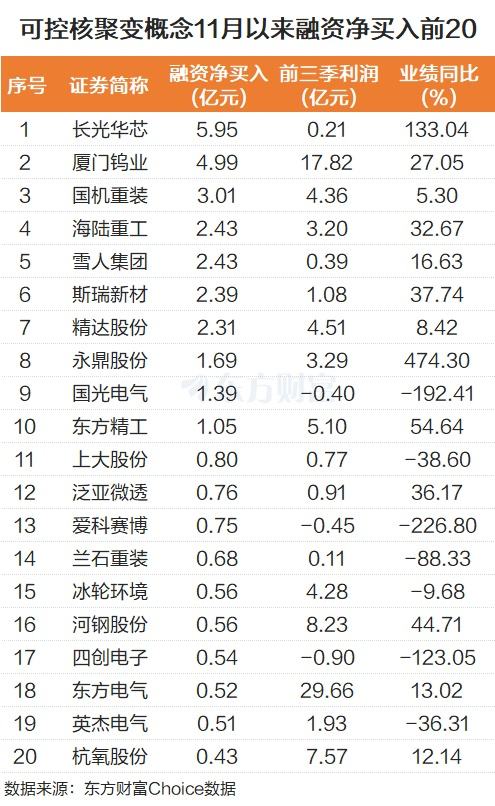 近来,可控核聚变概念也被杠杆资金积极抢筹,11月以来合计净流入超10亿元。个股而言,长光华芯被融资净买入最多,为5.95亿元。该股前三季度归母净利润为0.21亿元,同比增长133.04%。