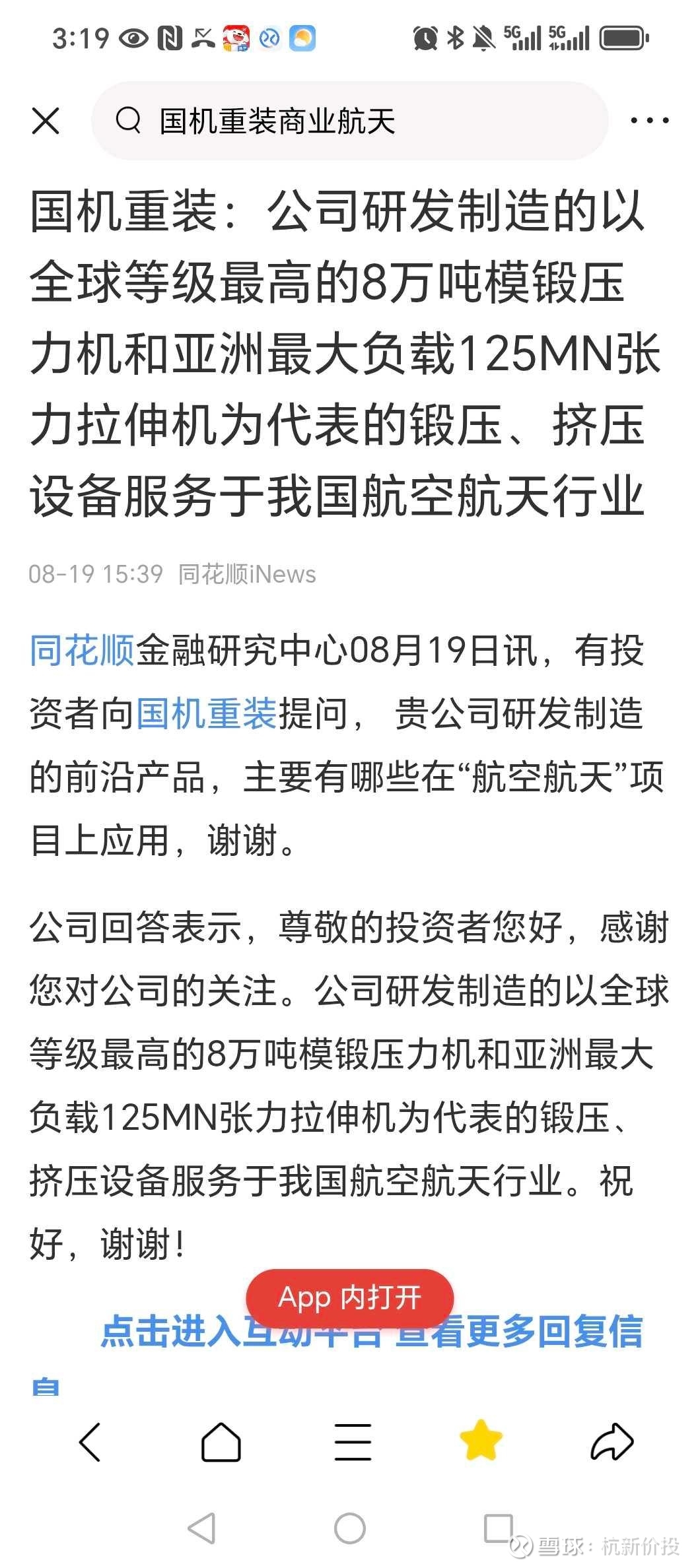 08月19日,国机重装互动平台回答,公司研发制造的以全球等级最高的8万吨模锻压力