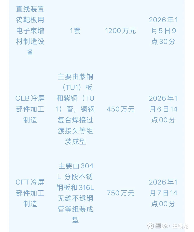 $国机重装(SH601399)$ 近日,中国科学院等离子体物理研究所发布采购项目。2025年年底和2026年相关的采购会非常多。(见图)
