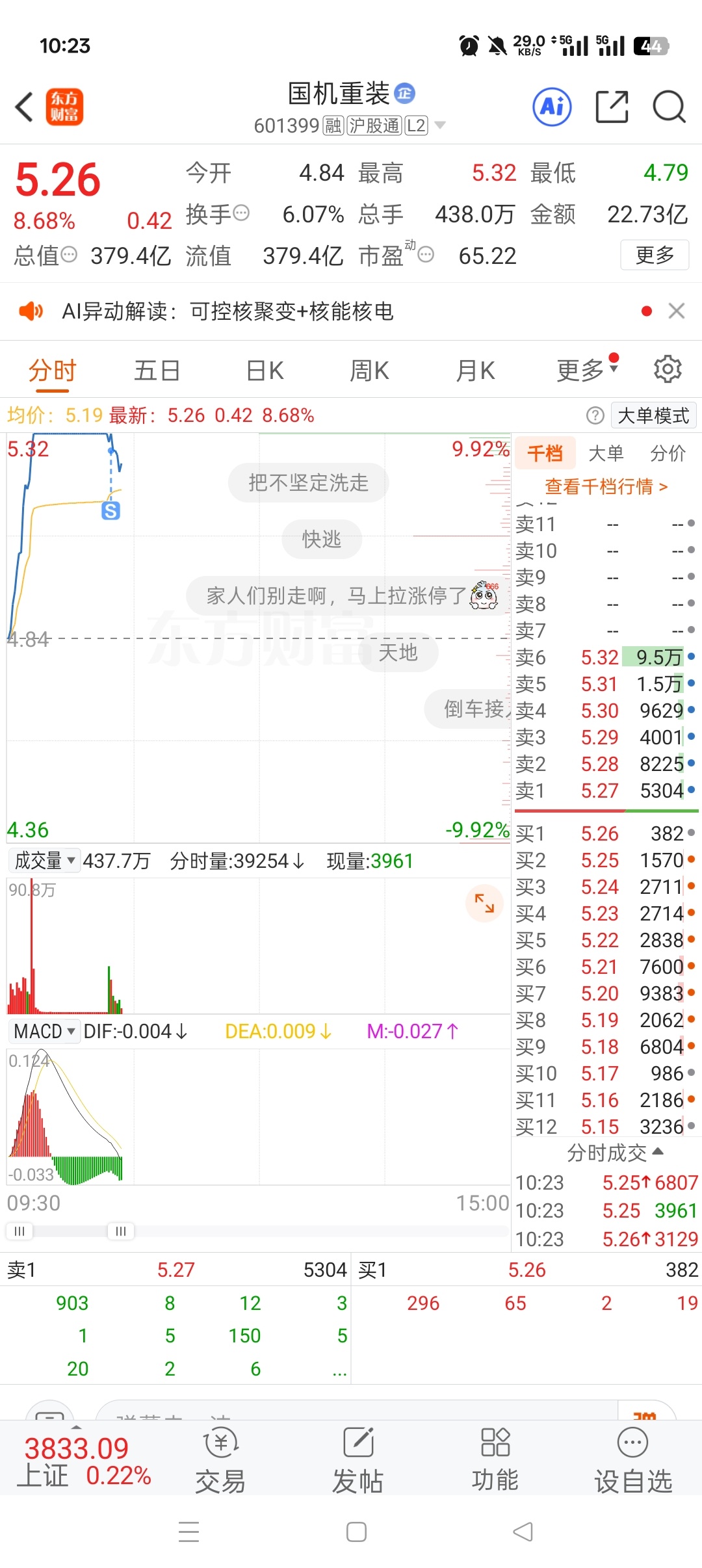 $国机重装(SH601399)$ 昨天跌停进的,炸板就跑,5.30全部清仓再见,现在的行情挣了就要跑,不能恋战