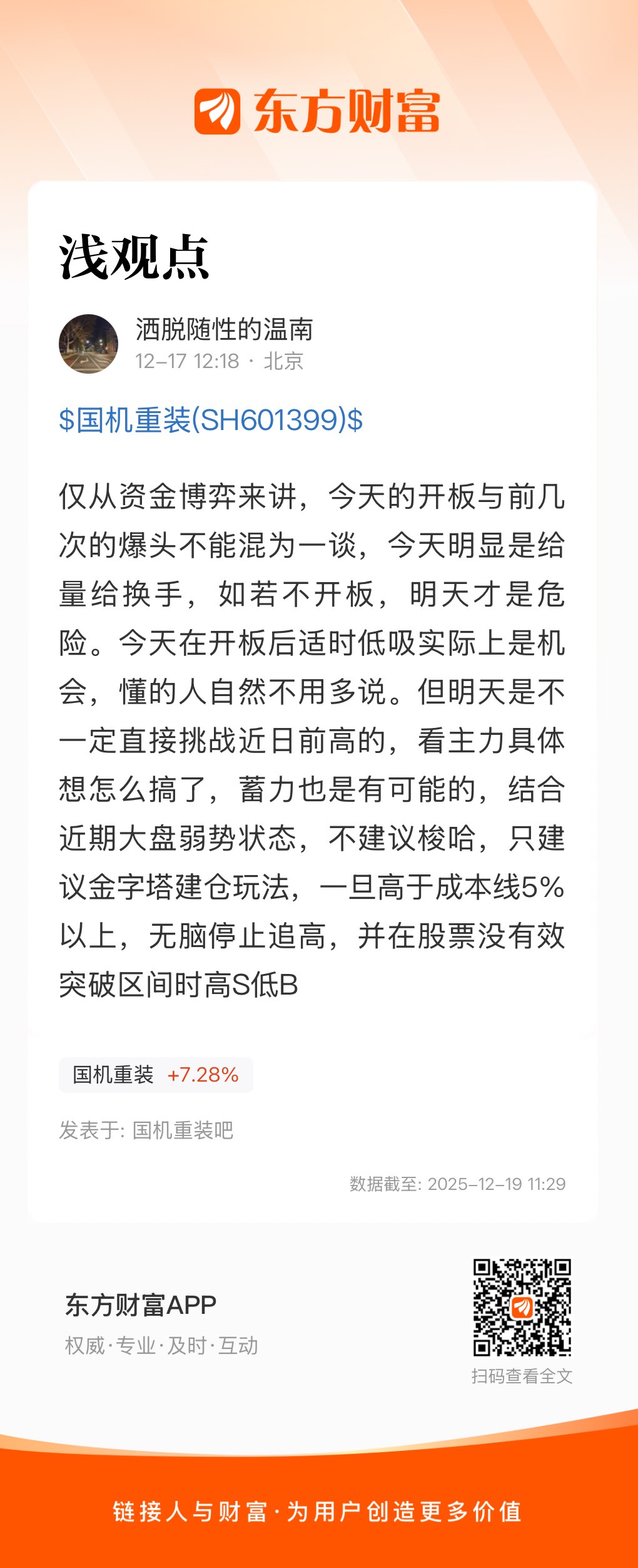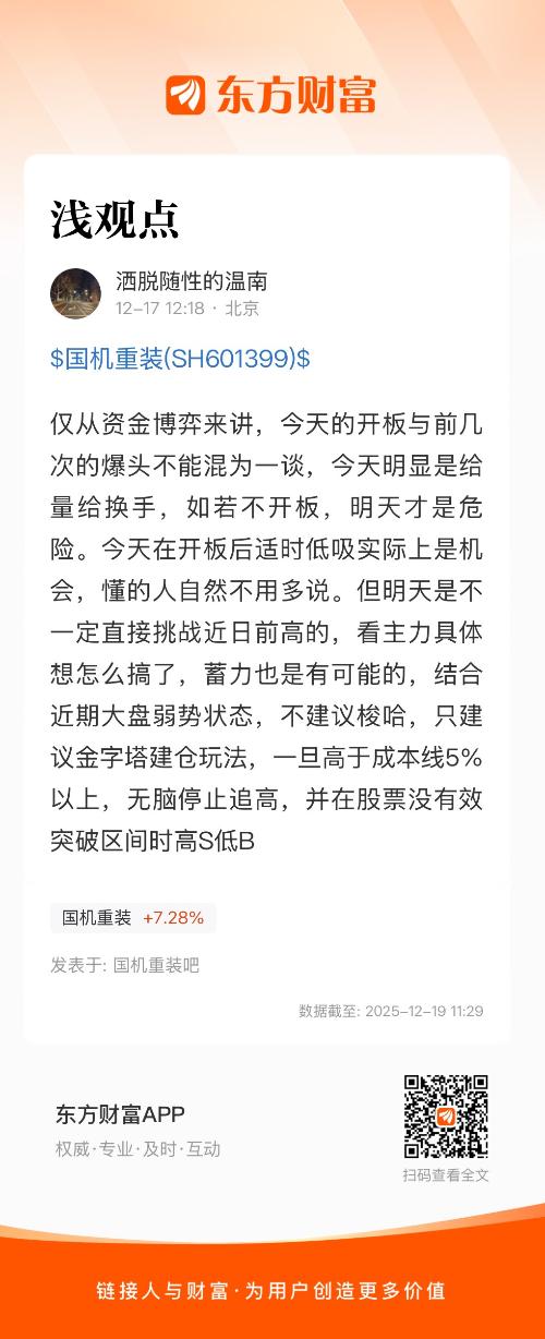 仅从资金博弈来讲,今天的开板与前几次的爆头不能混为一谈,今天明显是给量给换手,如若不开板,明天才是危险。今天在开板后适时低吸实际上是机会,懂的人自然不用多说。但明天是不一定直接挑战近日前高的,看主力具体想怎么搞了,蓄力也是有可能的,结合近期大盘弱势状态,不建议梭哈,只建议金字塔建仓玩法,一旦高于成本线5%以上,无脑停止追高,并在股票没有效突破区间时高S低B