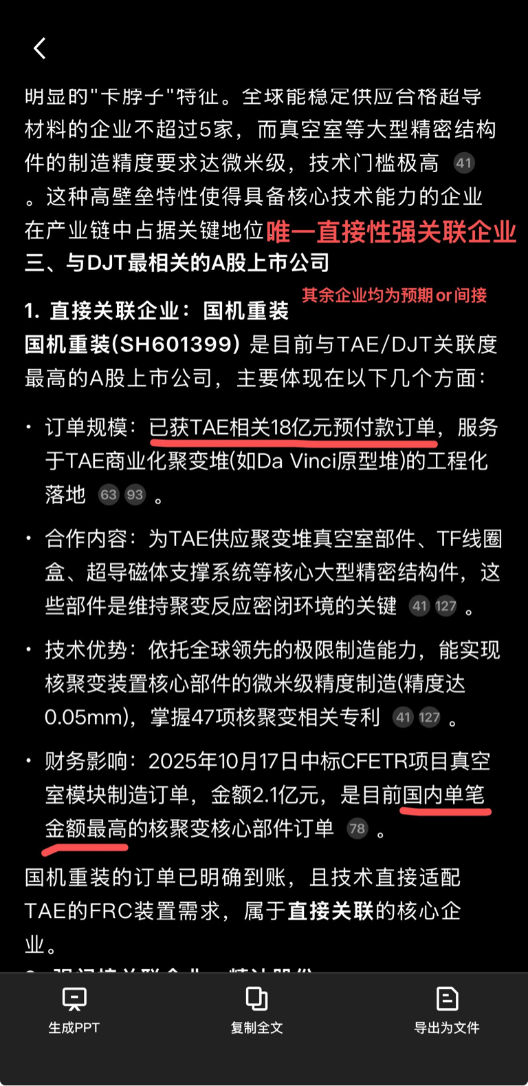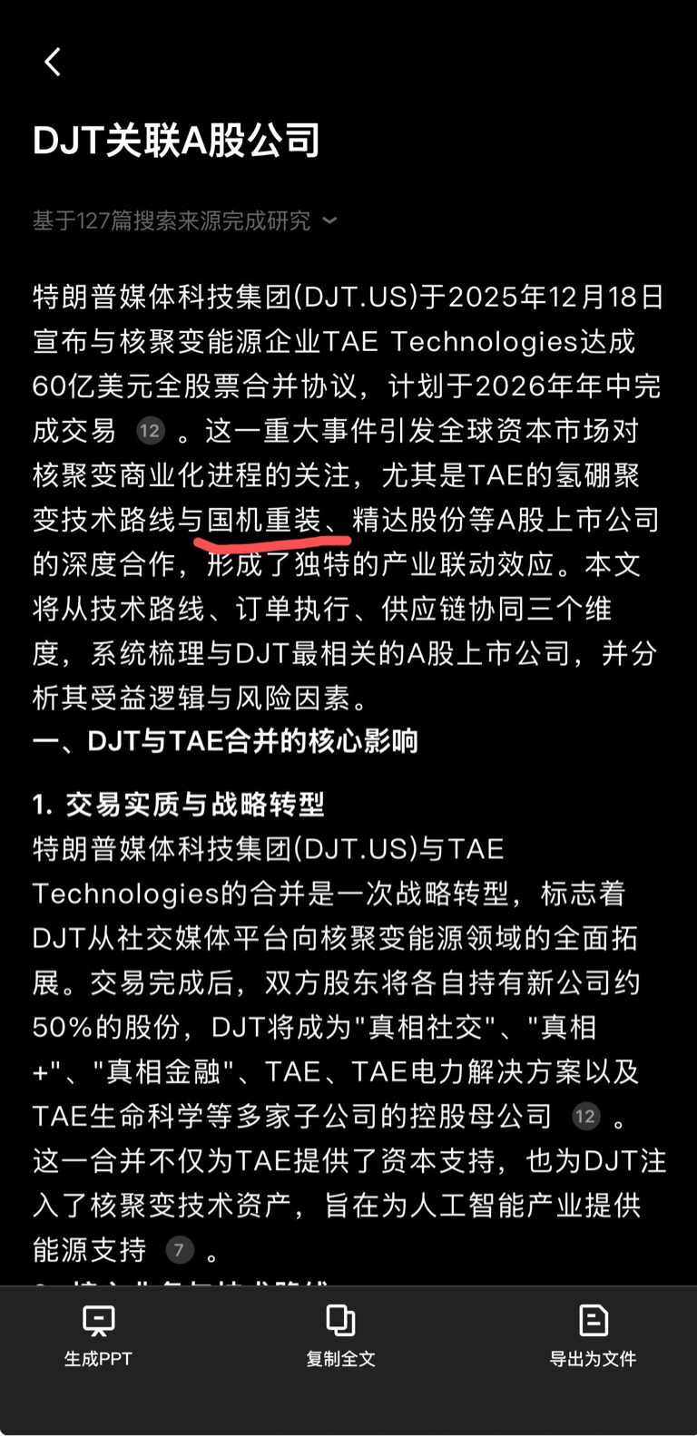 去千问最准的“深度研究”功能使用(每天只可以用五次) 国机重装确实是DJT唯一直接性关联企业,这点没的说。