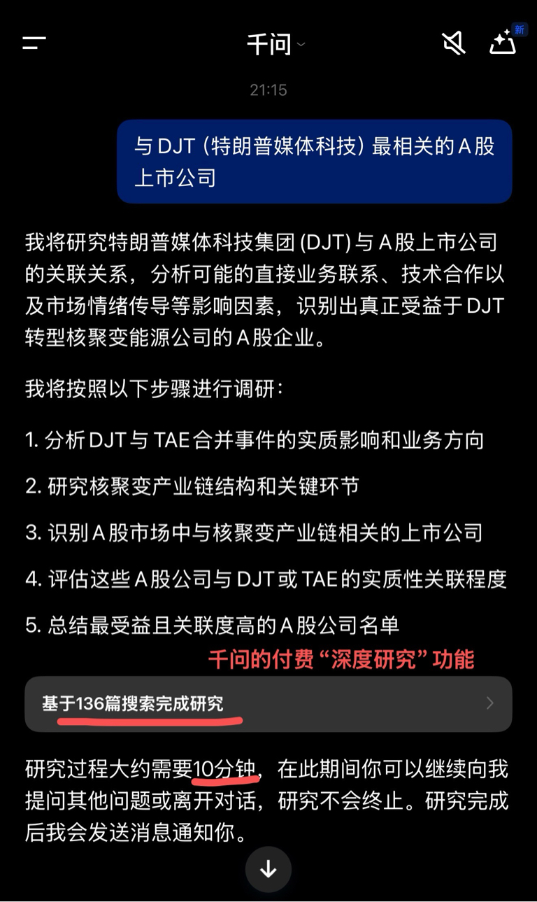 去千问最准的“深度研究”功能使用(每天只可以用五次)国机重装确实是DJT唯一直接