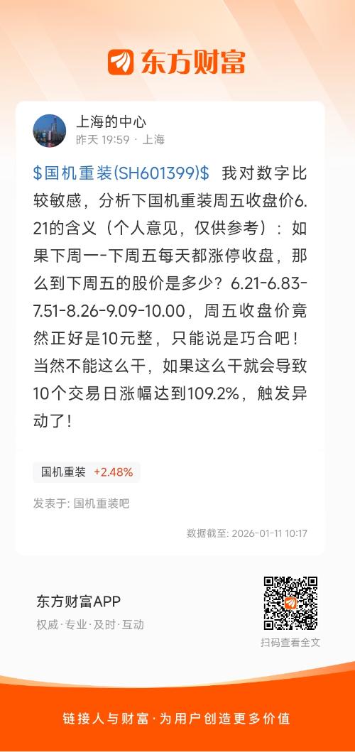 $国机重装(SH601399)$ 我对数字比较敏感,分析下国机重装周五收盘价6.21的含义(个人意见,仅供参考):如果下周一-下周五每天都涨停收盘,那么到下周五的股价是多少?6.21-6.83-7.51-8.26-9.09-10.00,周五收盘价竟然正好是10元整,只能说是巧合吧!当然不能这么干,如果这么干就会导致10个交易日涨幅达到109.2%,触发异动了!