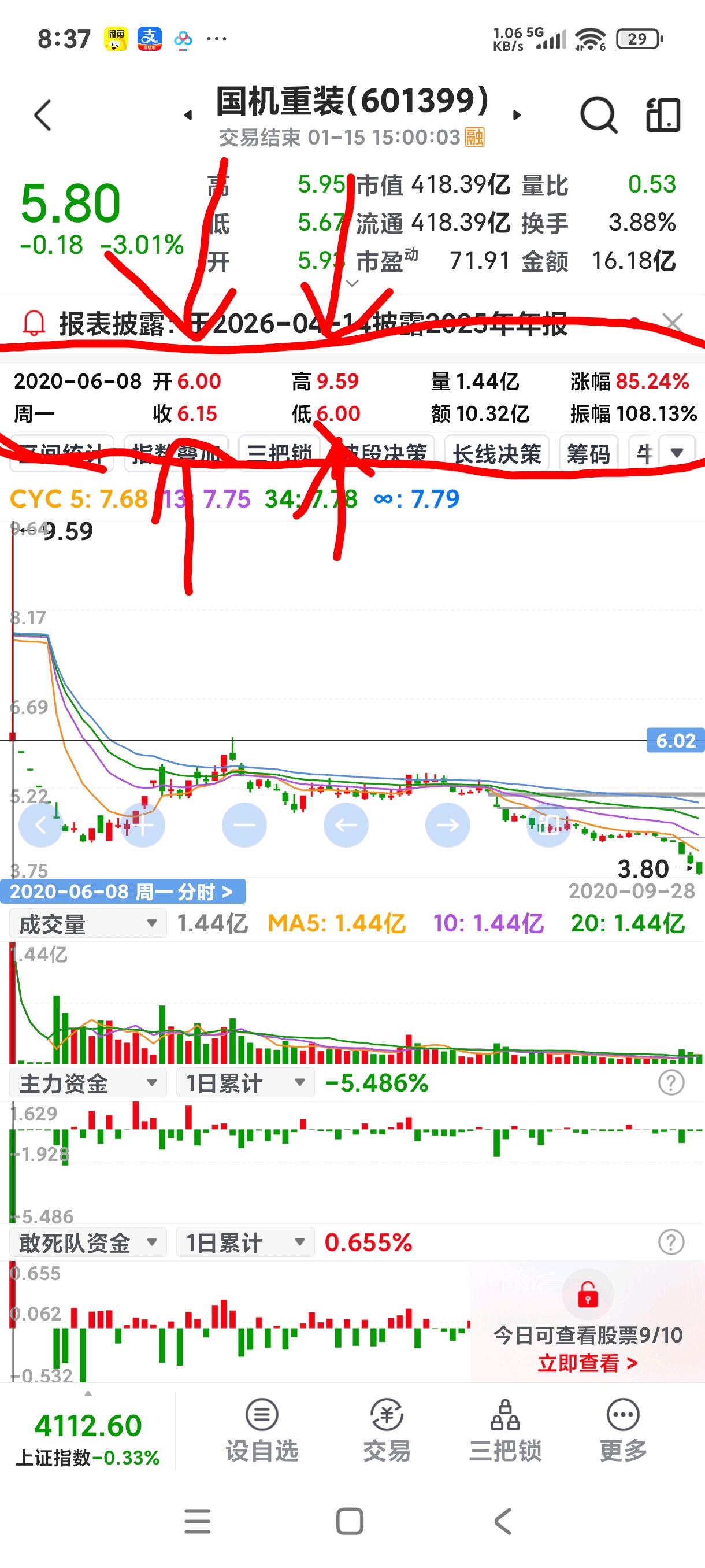 国机重装2020年六月八号上市开盘第一天,六块钱开盘,开盘就是最低价,最高冲到9.59,收盘6.15。这波国机最高摸到6.65下来,按理说已经把上市第一天套牢的人都解放了,上边套牢筹码很少了,可是为啥又开始狠狠洗盘?按理说他已经突破日线新高,上边几乎没压力了,可以轻松拉升了,为啥这几天跌这么多?也没有啥利空,说白了主力就是为了洗你,为了后边拉升不带你一起吃肉,这几天这么个跌法,估计很多散户受不了又跑了,问题是你不跑,主力洗谁呀!你跑了,不坚定的筹码交换出去了,主力后边拉起来抛压才会小。这里本来都没啥压力,它还往下打,你怕啥!扛不住洗盘,就吃不到肉肉!